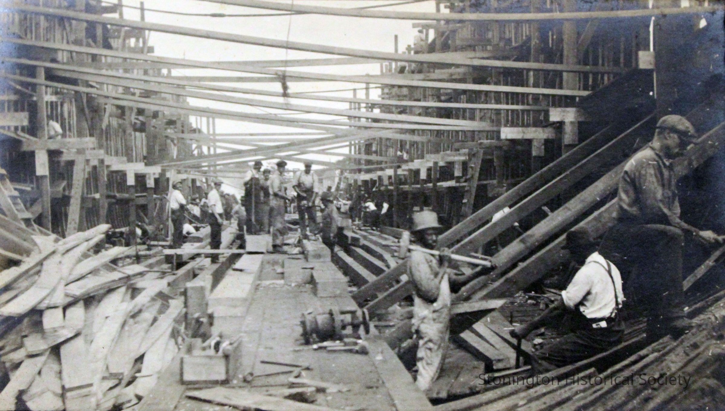 Workers inside the Lansing, c.1918. Image shows workers, tools, and materials strewn about. The Lansing steamship was rebuilt by the Ship Construction and Trading Company, Inc. of Stonington for the Nafra Company of New York.Made/Created