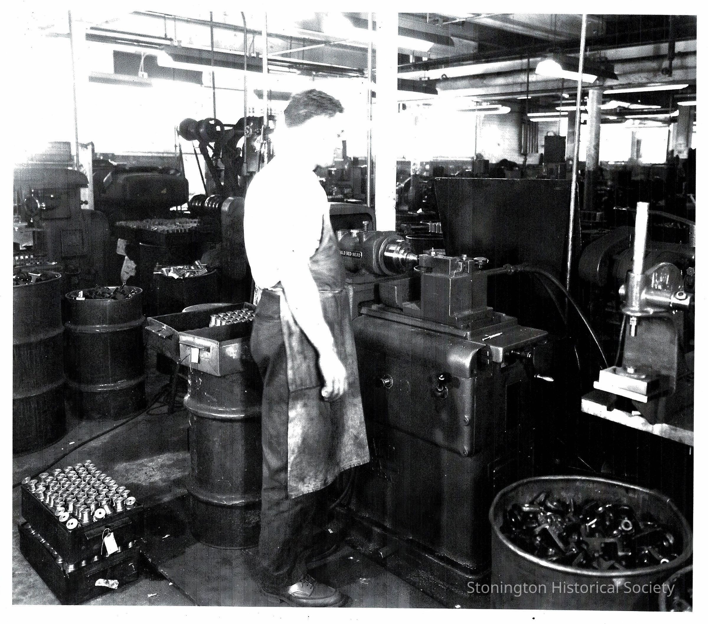 Worker standing in front of machinery in the Atwood Machine Company in the 1940s. He is most likely using a Phillips Drill Company machine known as the Red Head, a masonry anchor system, which included electric hammer drills for metal and wood as well as concrete.Collection