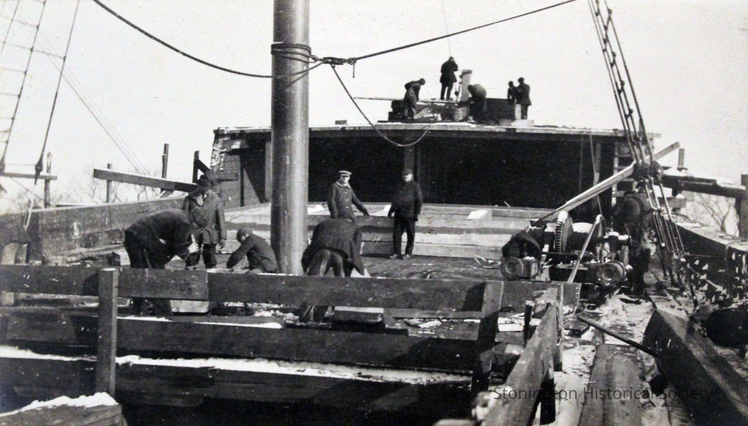 A group of workers building the upper decks of the SS Lansing at Stonington in the winter of 1918-1919. The center mast has been installed. The Lansing steamship was rebuilt by the Ship Construction and Trading Company, Inc. of Stonington for the Nafra Company of New York.Made/Created