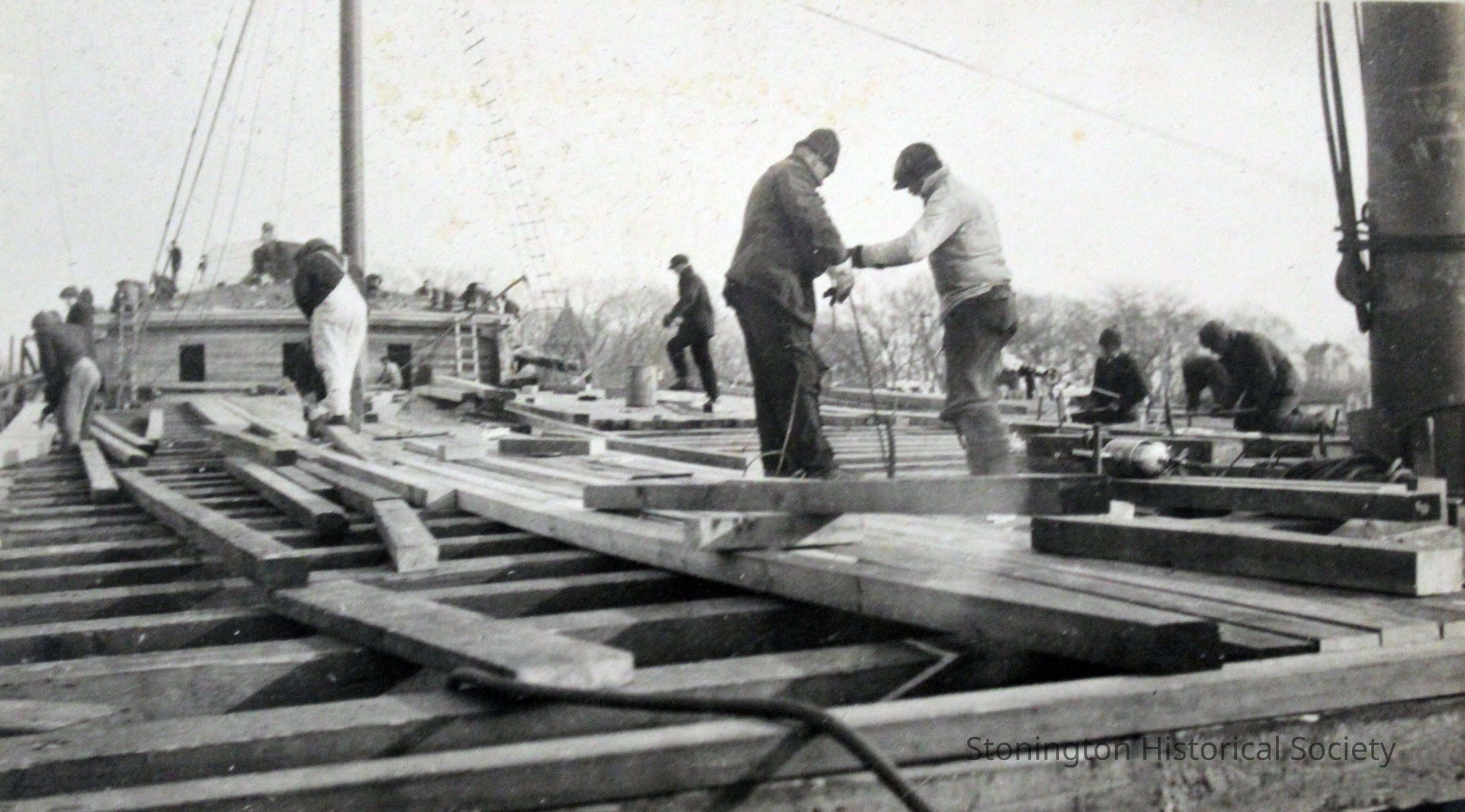 Workers on the upper decks of the SS Lansing, under construction. The Lansing steamship was rebuilt by the Ship Construction and Trading Company, Inc. of Stonington for the Nafra Company of New York.Made/Created