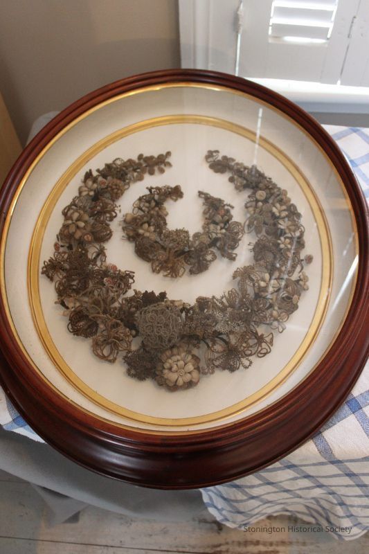 Victorian hair wreath in dark wood oval frame (mahogany?) with glass front and gold trim. Frame contains inner and outer "horseshoe" arrangement of hair "flowers."Artwork Details