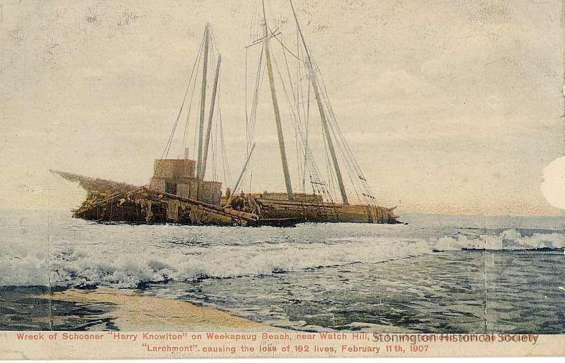Wreck of Schooner "Harry Knowlton" on Weekapaug Beach, near Watch Hill RI, who collided with the Steamer "Larchmont", causing the loss of 192 lives, Feb. 11, 1907