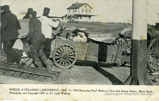 Wreck of Steamer "Larchmont" Feb. 11, 1907. Removing dead bodies at New Life Saving Station, Block Island.