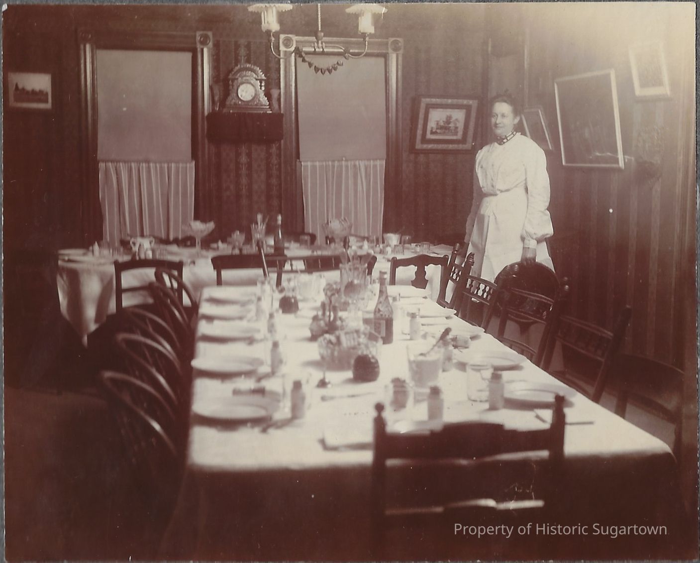 Photograph of Flora DeEtta Hall (1858-1932) labeled "Det and their Dining Room." "Their" may refer to the dining room in the home inhabited by DeEtta and her mother and sister, Rosanna B. Smith Hall (1836-1905) and Lulu Mabel Hall (1863-1937). "Their" could also refer to the unidentified building featured in the photograph on the previous page of the album (see: 2023.006.090).