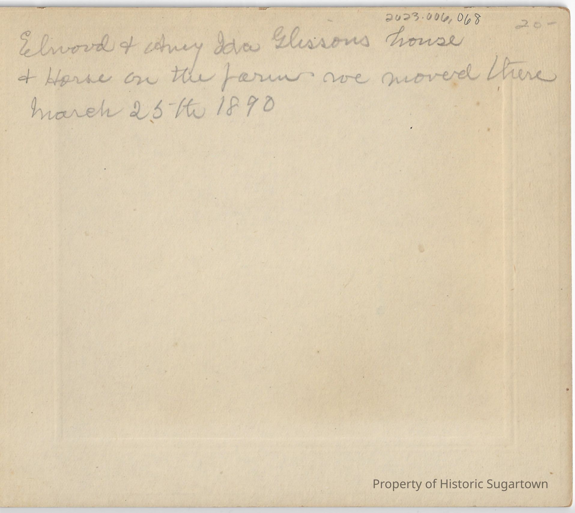 Elwood Glisson (1855-1938) and a horse on front of the home on his and Amy Ida Williams Glisson (1857-1944)'s farm. It is captioned “We moved there March 25th 1890”.Collection