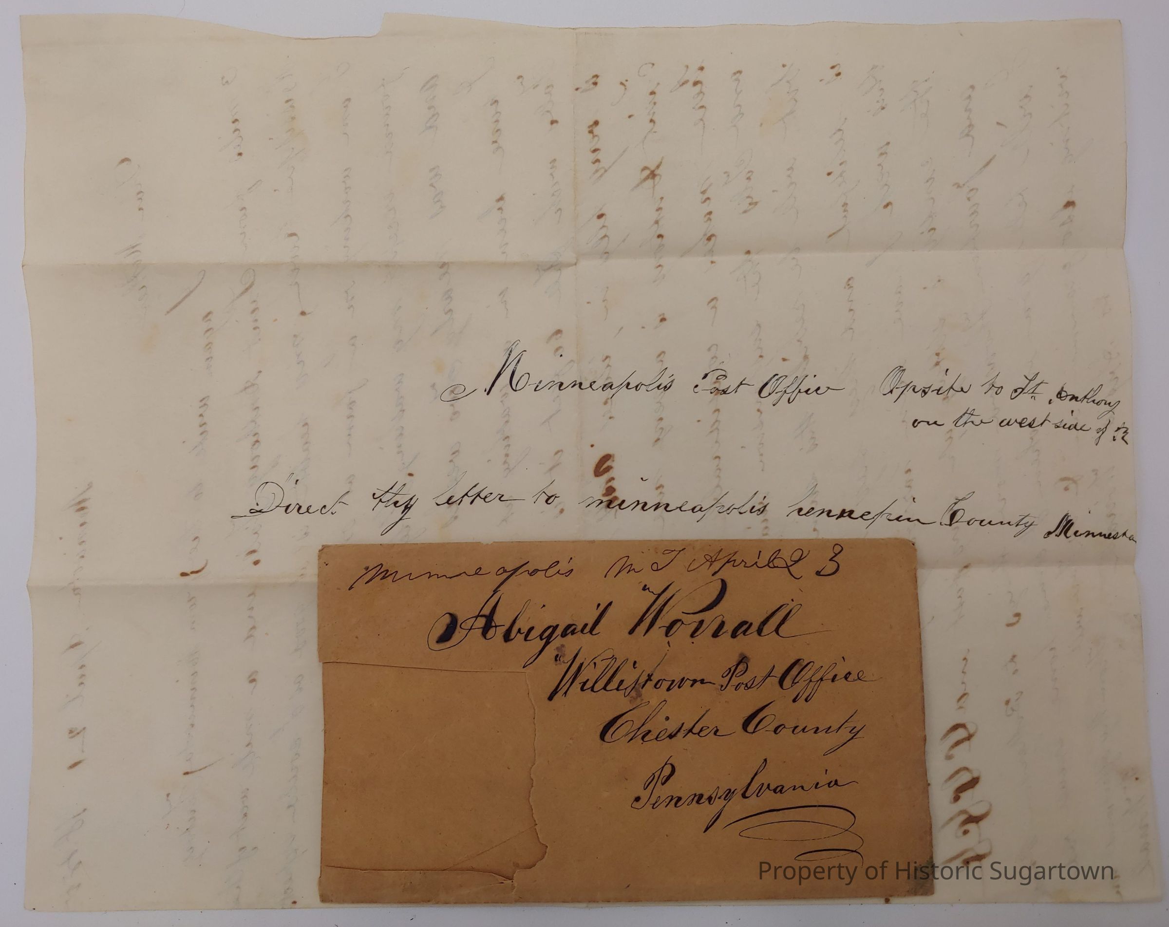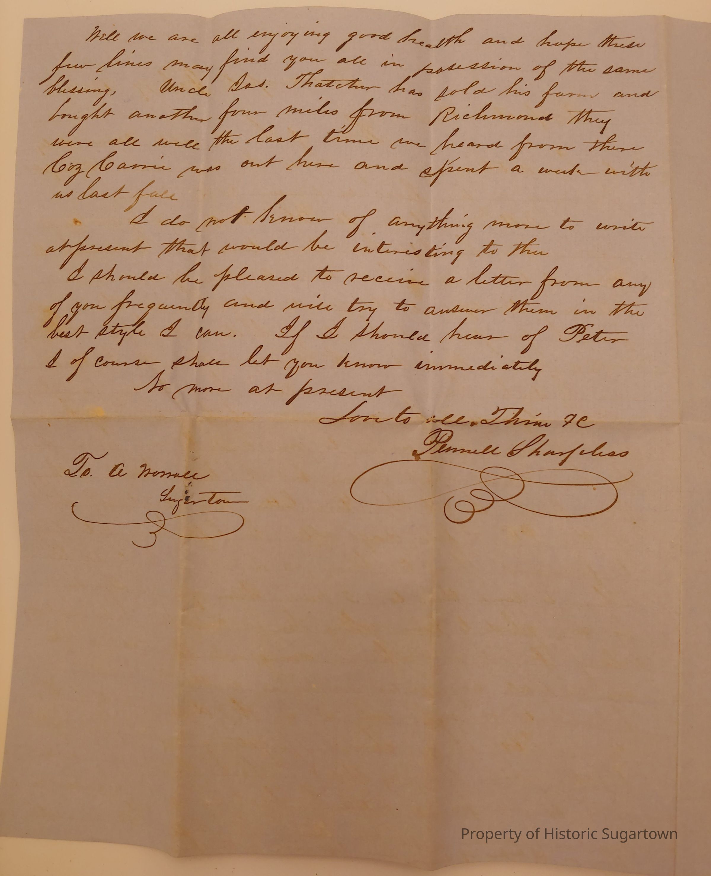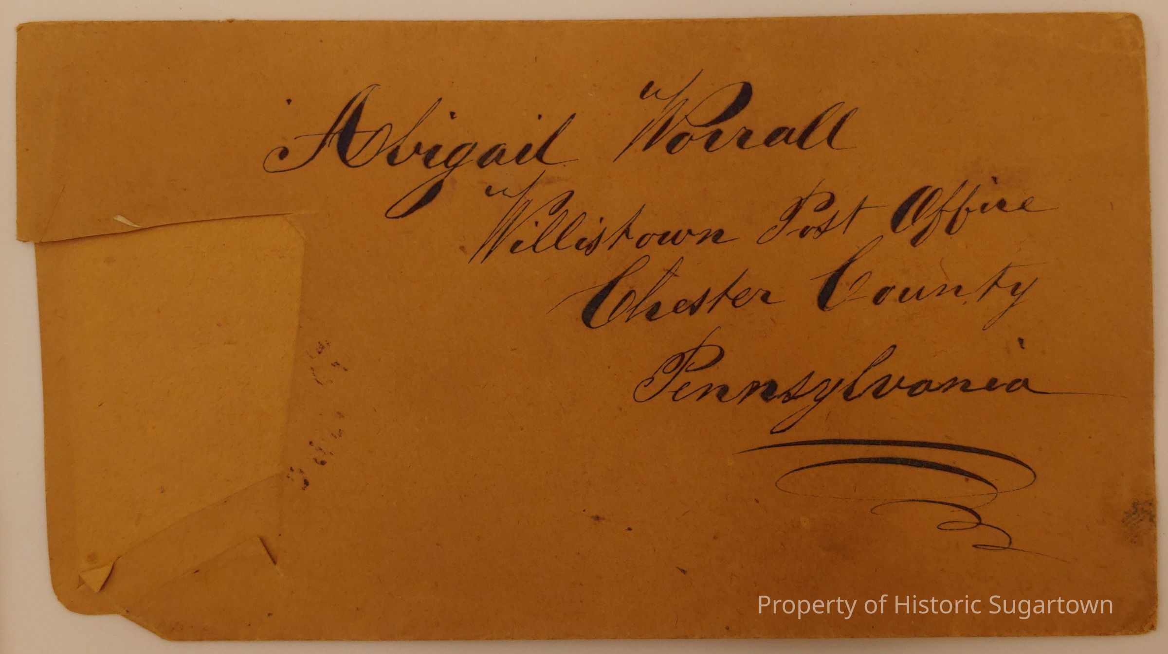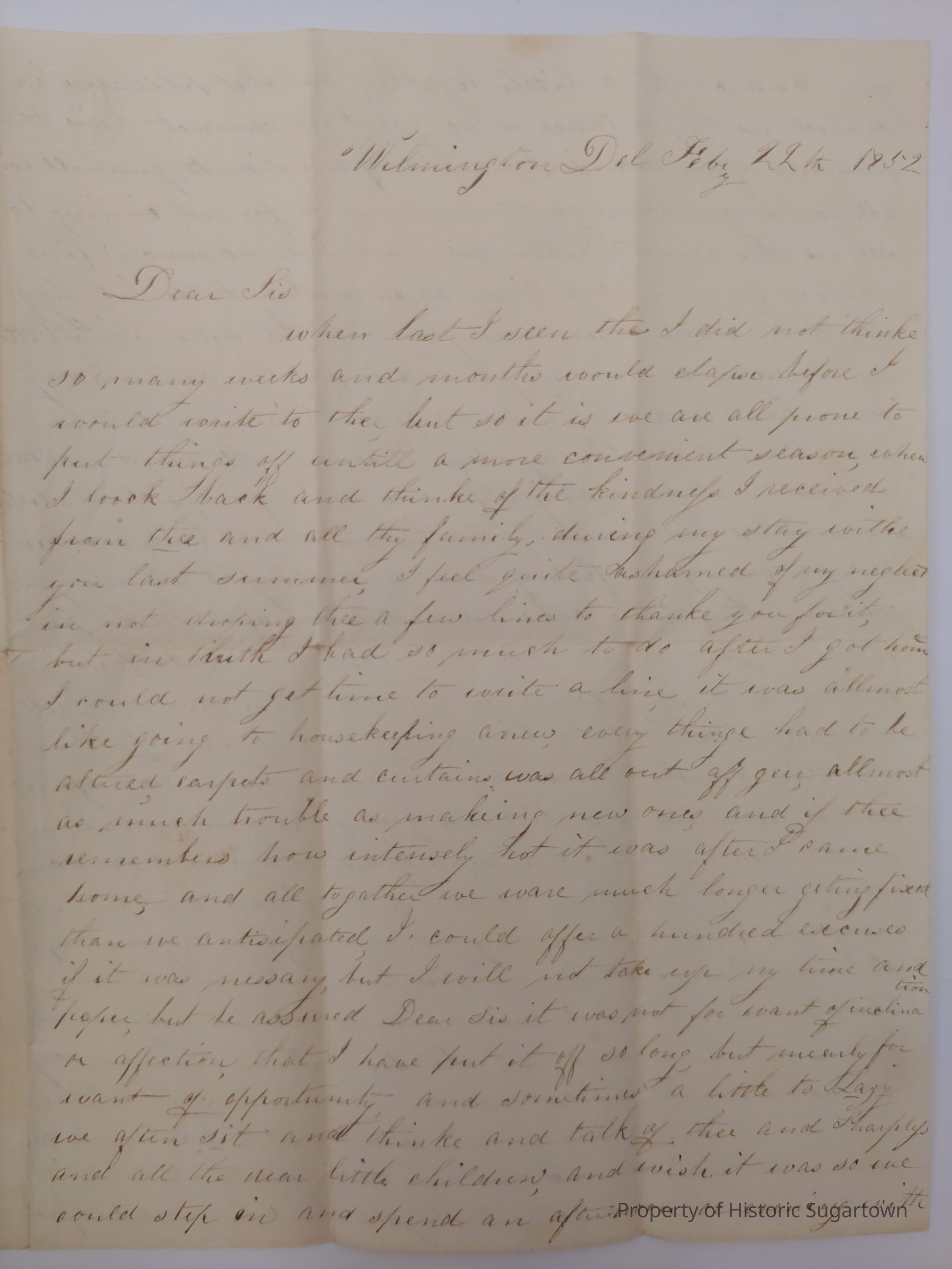 Feb. 22nd, 1852 Letter from Abigail Worrall's sister Sallie A. Thatcher mentioning not having seen each other in a while and her annoyance with Sharpless (Abigail's husband) not keeping his promise to visit. She asks about Abigail's children including Hanna, mentions a funeral she was unable to attend, and describes her recent illness, possibly influenza. "Eli Yarnell" and "Aunt Phebe" are mentioned; Sent from Wilmington, DE.