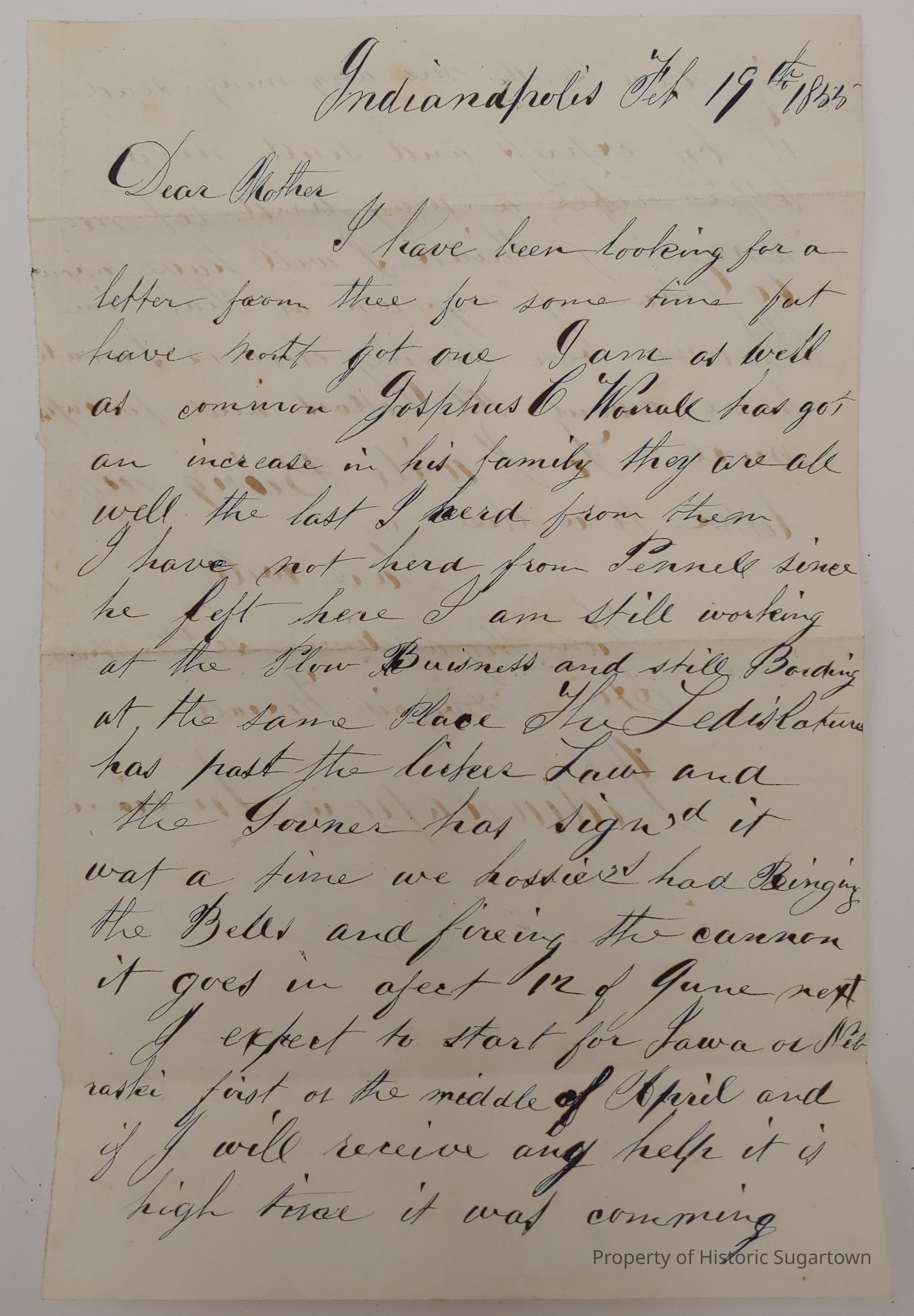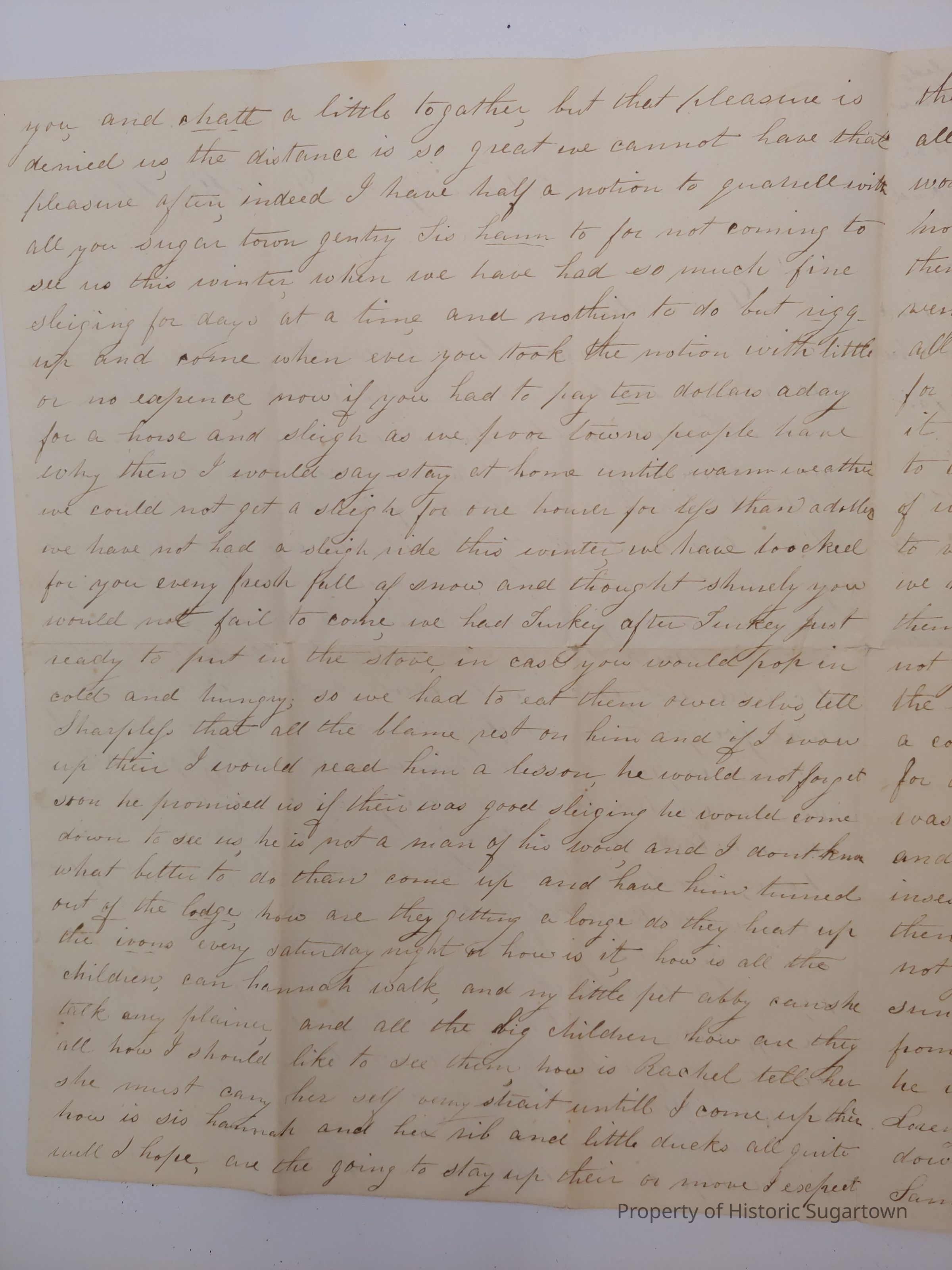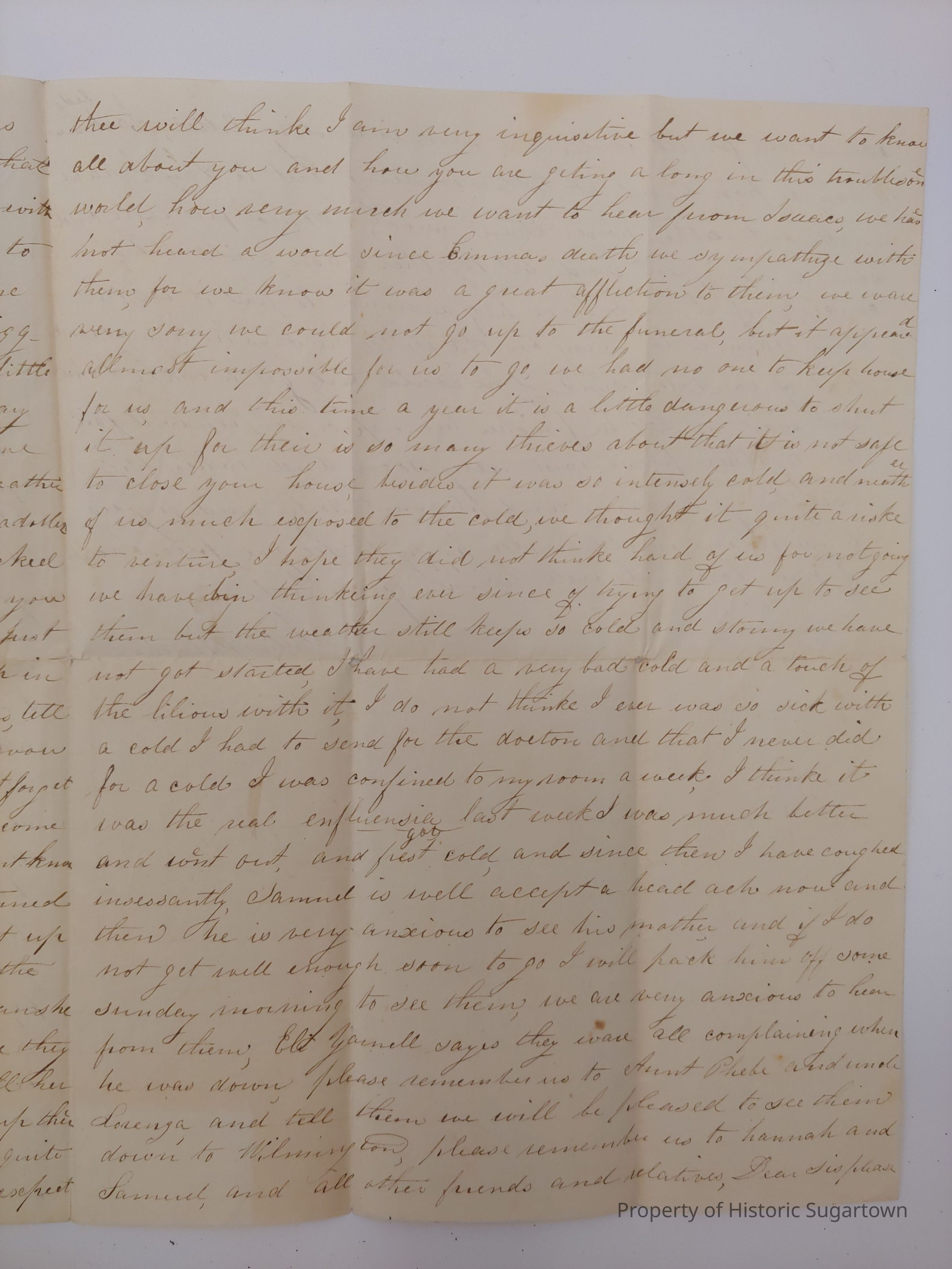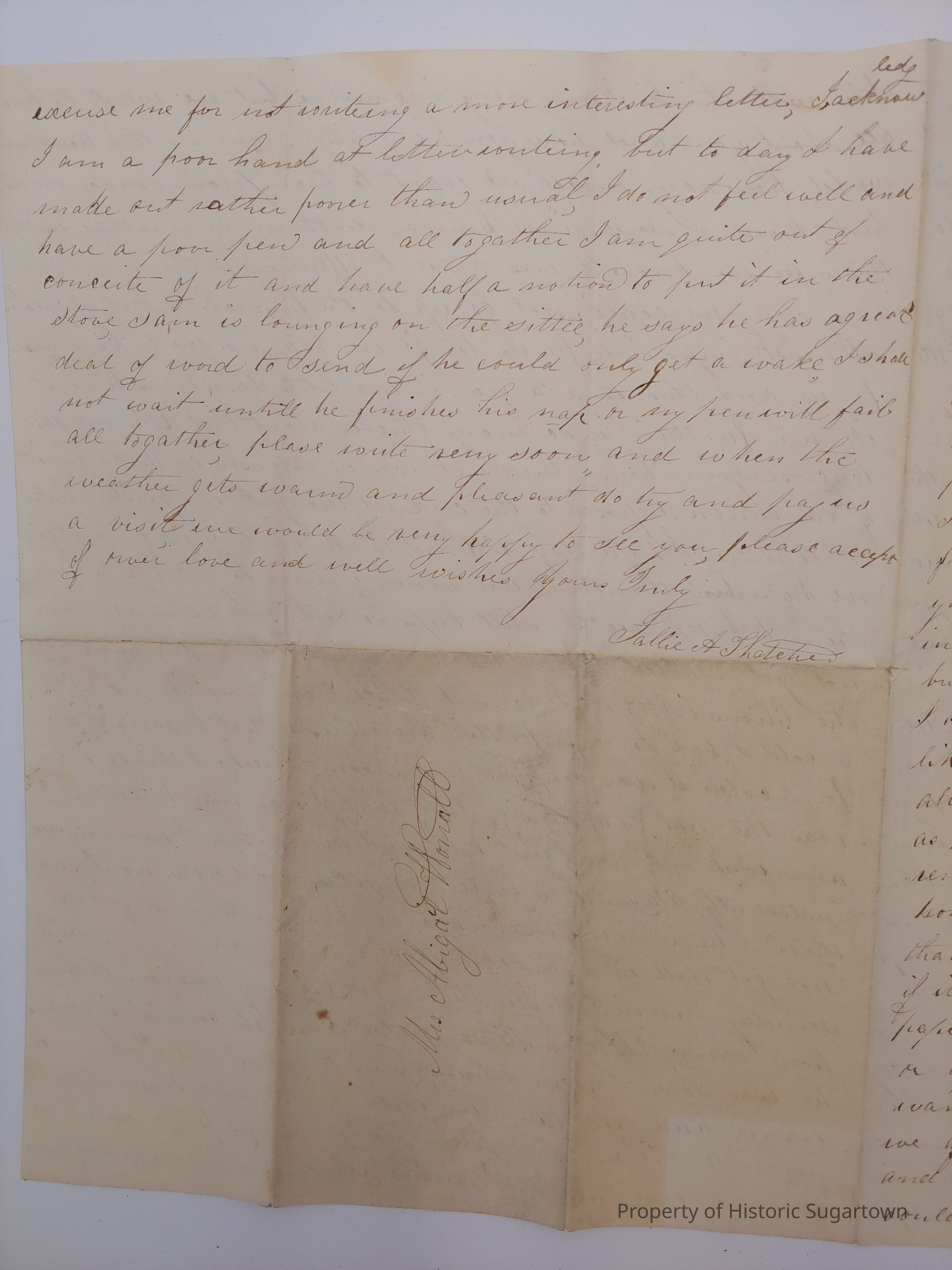 Feb. 22nd, 1852 Letter from Abigail Worrall's sister Sallie A. Thatcher mentioning not having seen each other in a while and her annoyance with Sharpless (Abigail's husband) not keeping his promise to visit. She asks about Abigail's children including Hanna, mentions a funeral she was unable to attend, and describes her recent illness, possibly influenza. "Eli Yarnell" and "Aunt Phebe" are mentioned; Sent from Wilmington, DE.