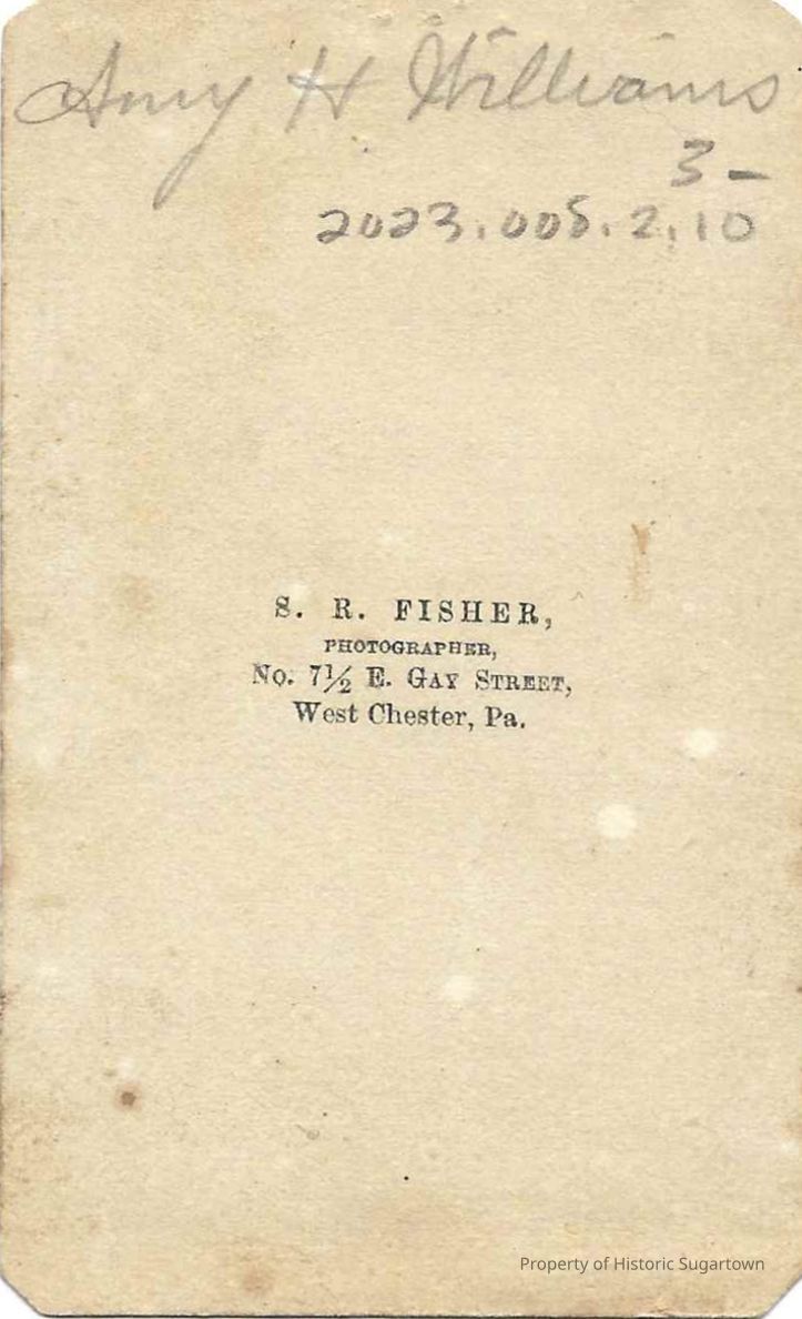 Carte-de-visite photograph of Amy H. Williams by West Chester, PA photographer Samuel R. Fisher at No. 7 1/2 East Gay Street, West Chester, PA.Collection