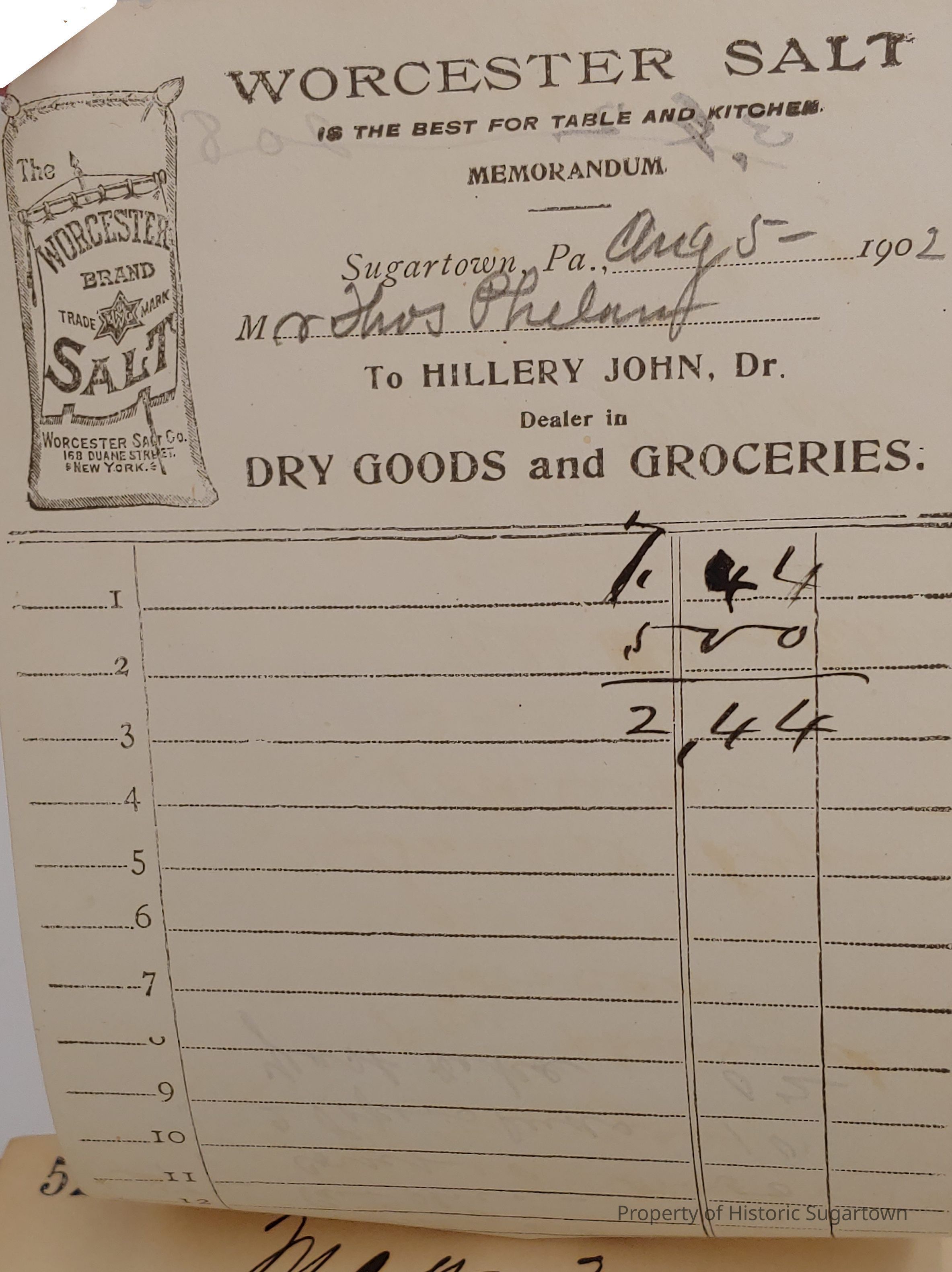 During the 1840s, Sharpless Worrall moved with his family to Sugartown in Willistown Township, Chester County, Pennsylvania, where he took over ownership of a general store and served as postmaster for 20 years. Upon his retirement, Worrall's son-in-law Hillery John took over the store, which he ran until his death. At that point it was taken over by Hillery's son, Clyde B. John, who eventually turned the business into an antiques shop. Worrall and John family papers and business records, 1830-1939, primarily consist of the business records of the general store under all three owners as well personal and family papers relating to the Worrall and John families.Context