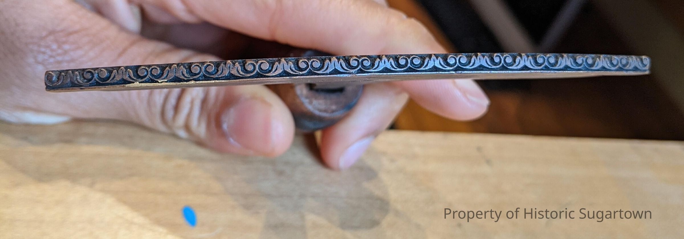 "Long stamp with looping scroll pattern, handle in excellent condition."-Adelaide Okonski.