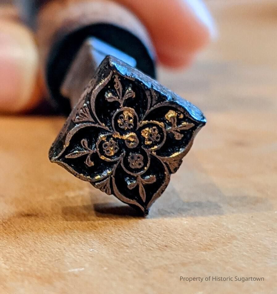 "Floral scroll pattern in a square shape slight singe marks on handle." -Adelaide Okonski.