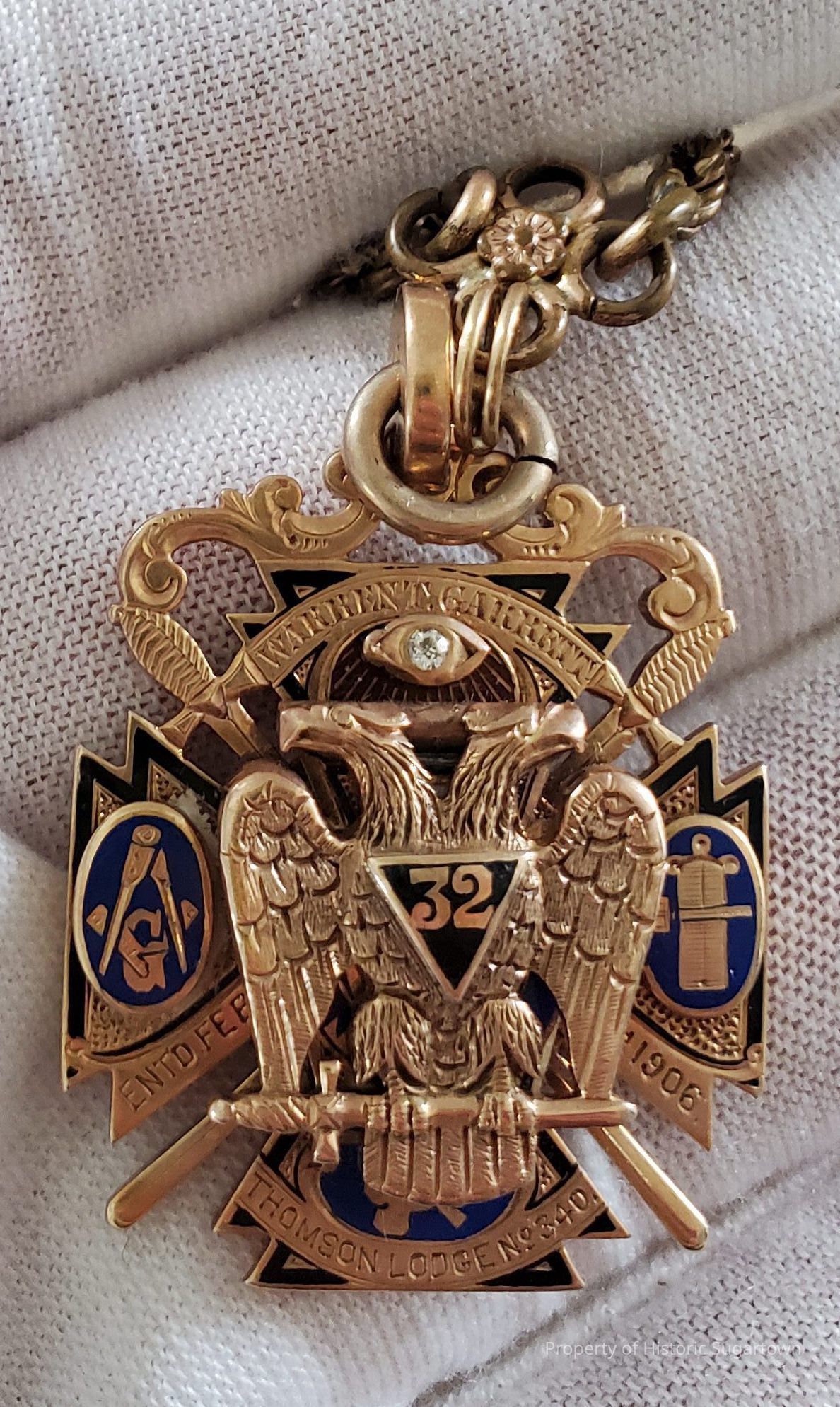 Masonic Temple pendant necklace 1907 Thompson Lodge No. 340 (32nd Degree Mason) belonging to Warren Garrett.Collection