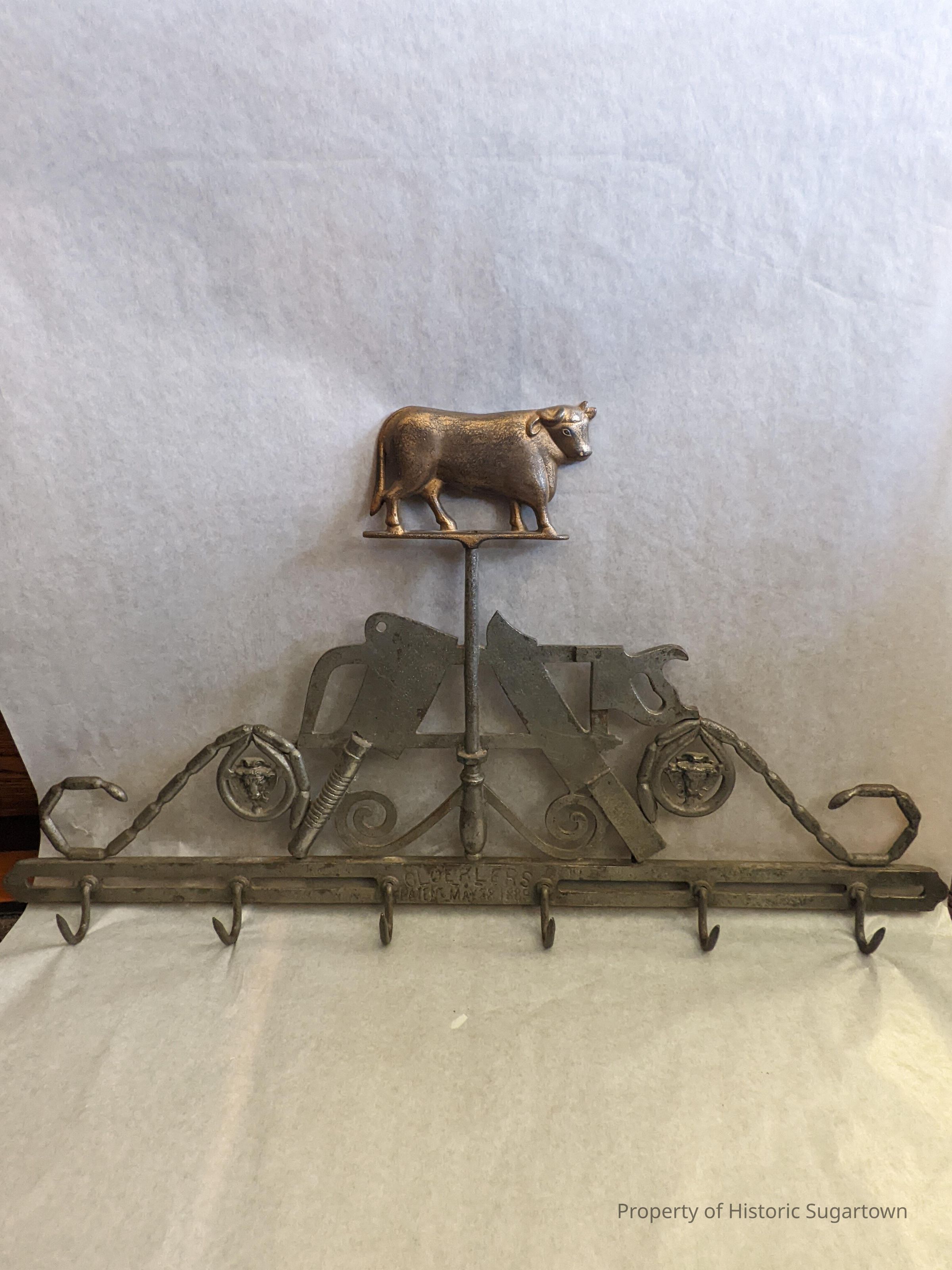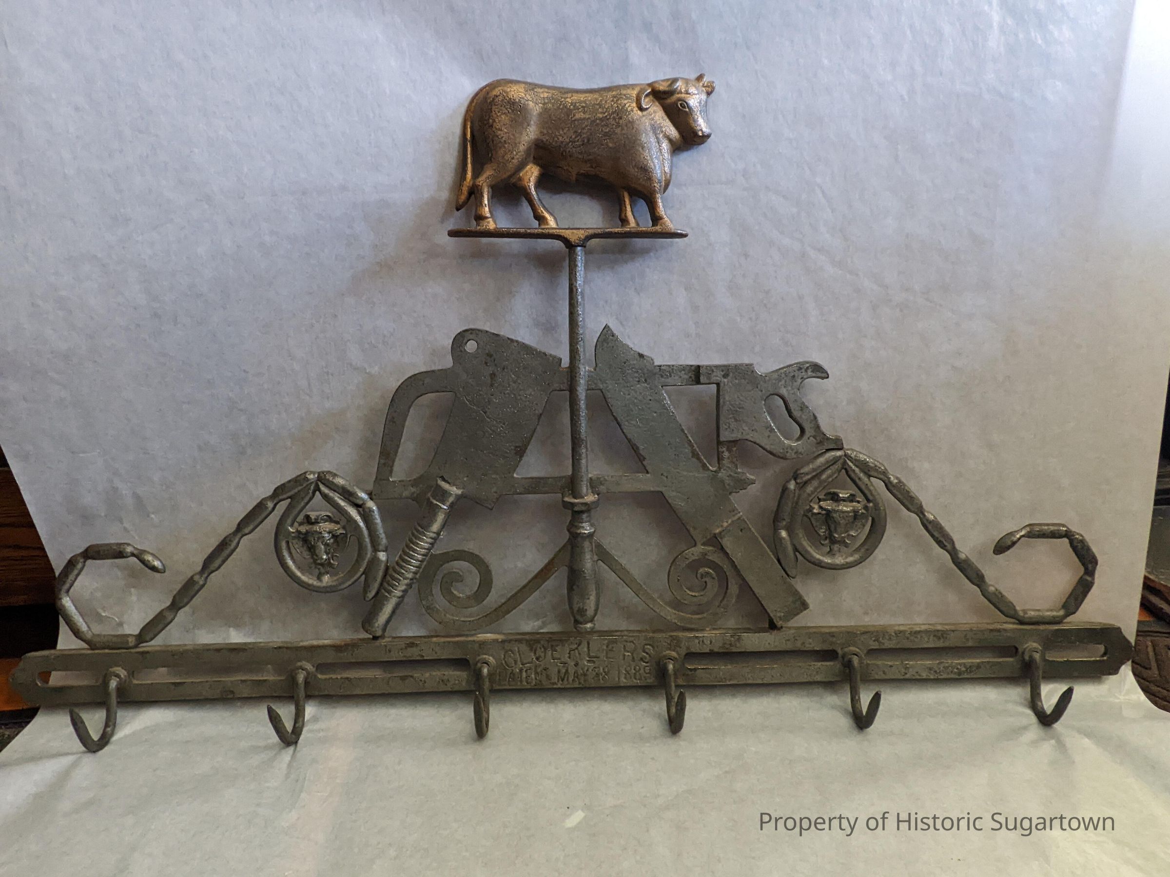 Meat rack manufactured by the Bernard Gloekler Company of Pittsburgh. Brass colored cow at top of rack. Wrought iron design features elements from butchering including cleavers, a bone saw, sausage links, and two cow faces. 6 hooks at base. This company operated from the 1870s through the 1920s. This is part of the Enterprise Collection donated by Marilyn Taylor's family, but is not an Enterprise-made item.