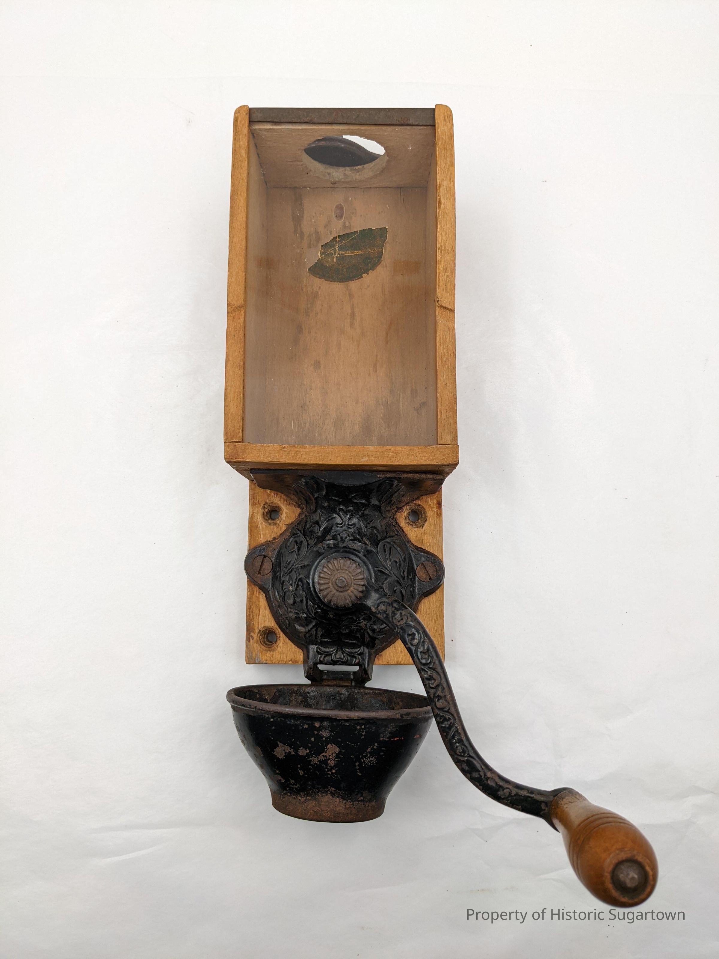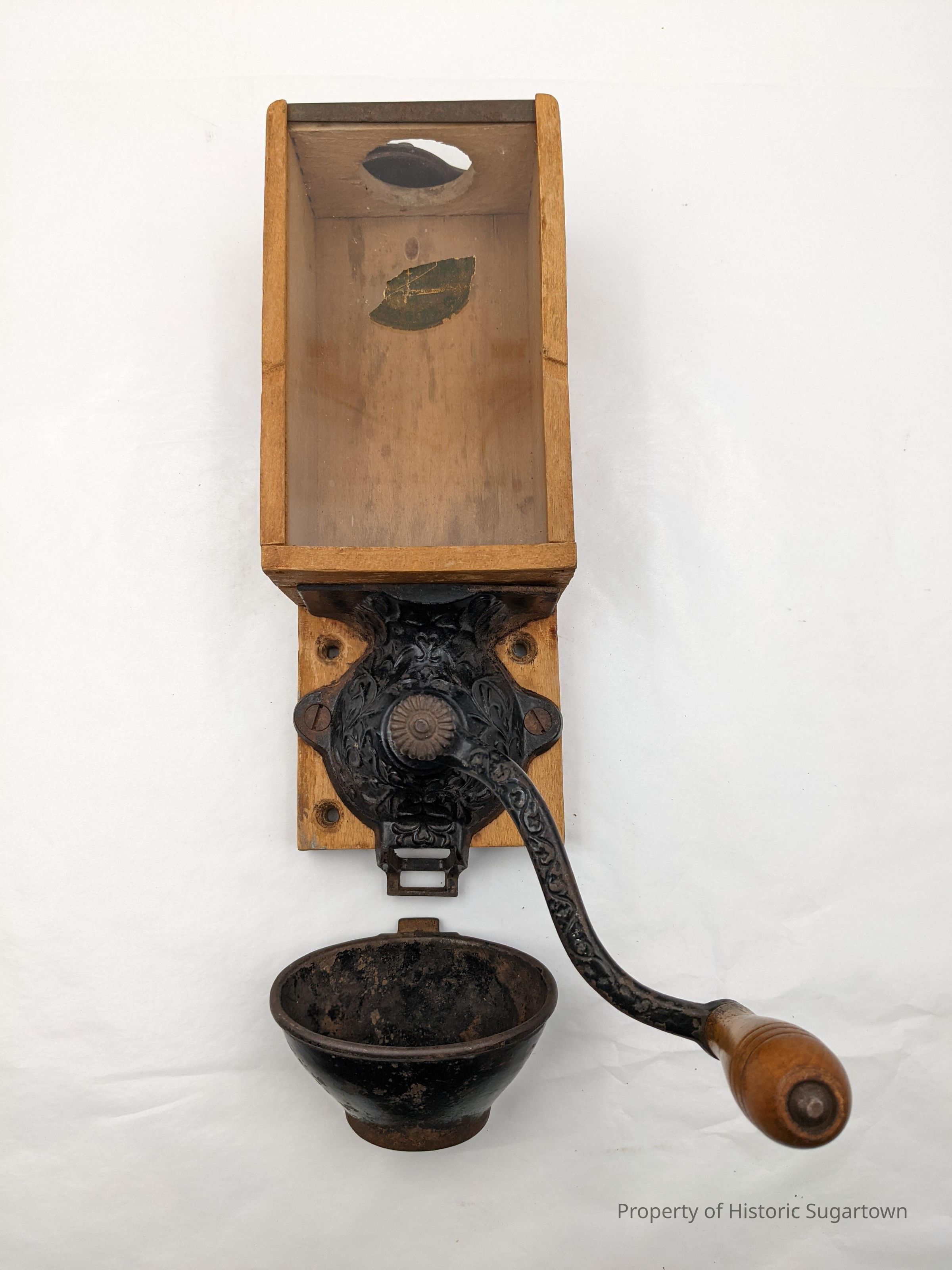 Grinding Mill with wooden hopper and decorative stamped cast iron grinder. Wooden handle.Collection