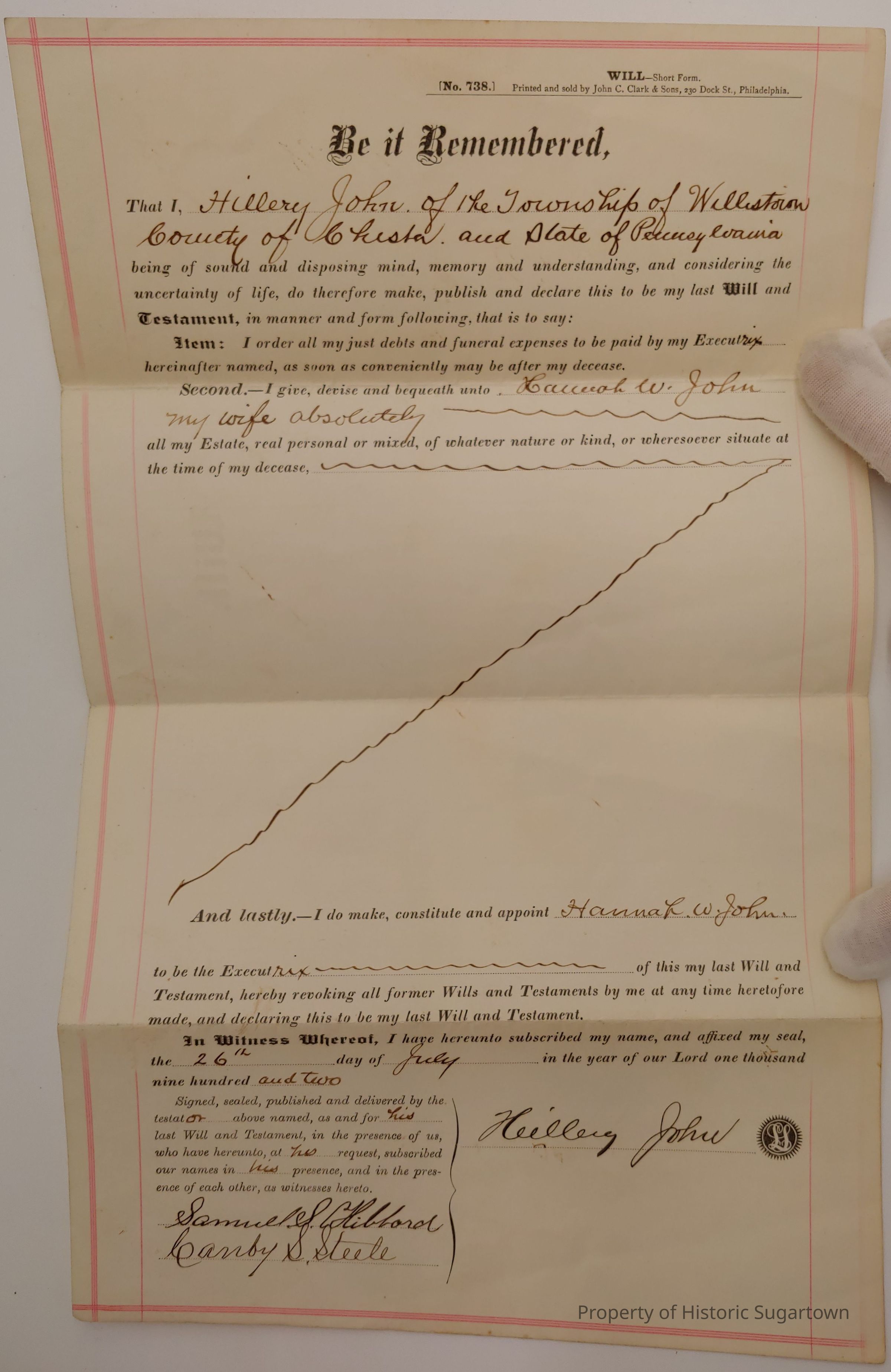Will of Hillery John bequeathing all of his Estate unto to his wife, Hanna Worrall JohnCollection