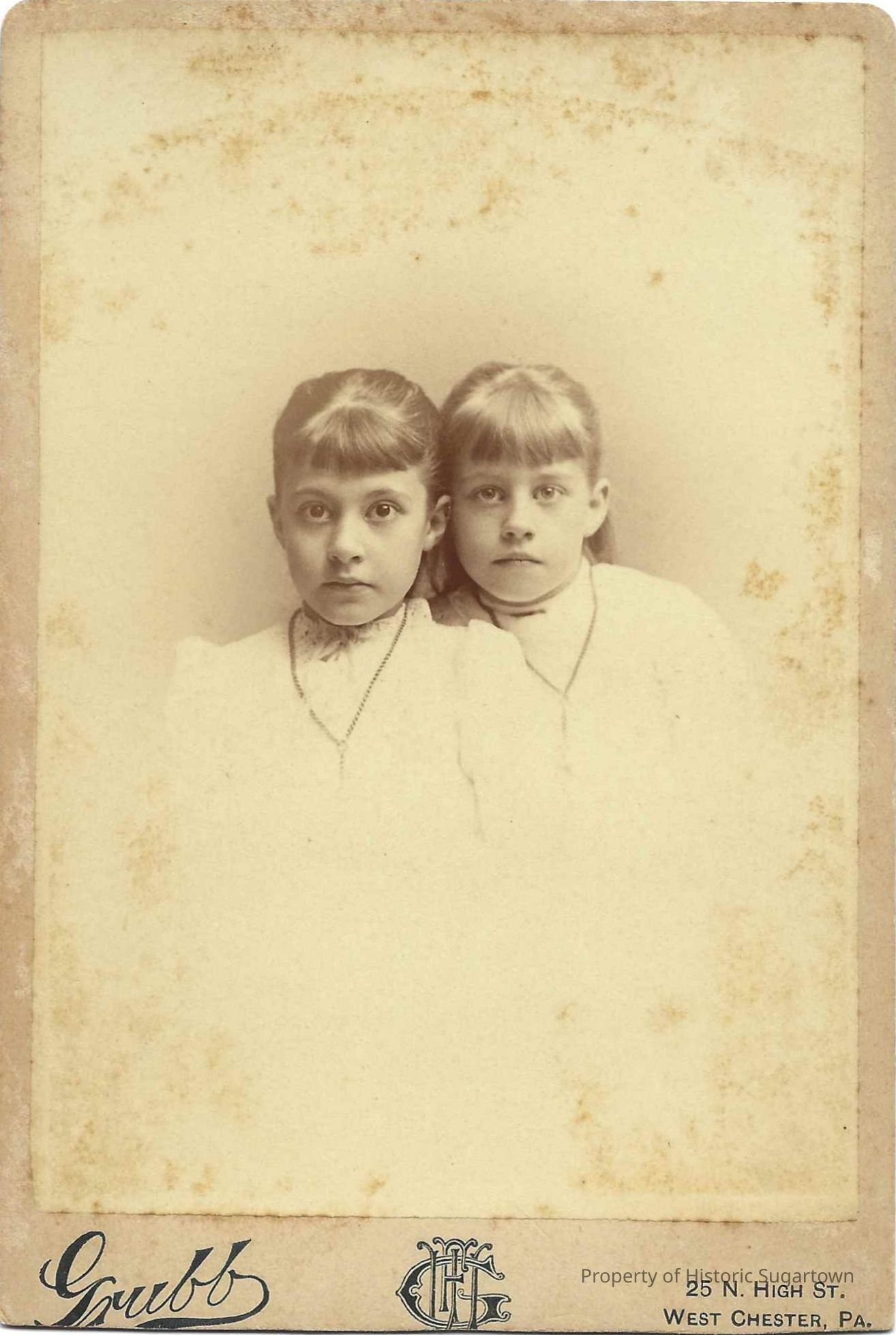 Cabinet Card photograph (c. 1890) of Clara C. Williams (1882-1966) and Ida May Williams (1884-1958) by photographer W. Francis Grubb at 25 North High St., West Chester, PA.