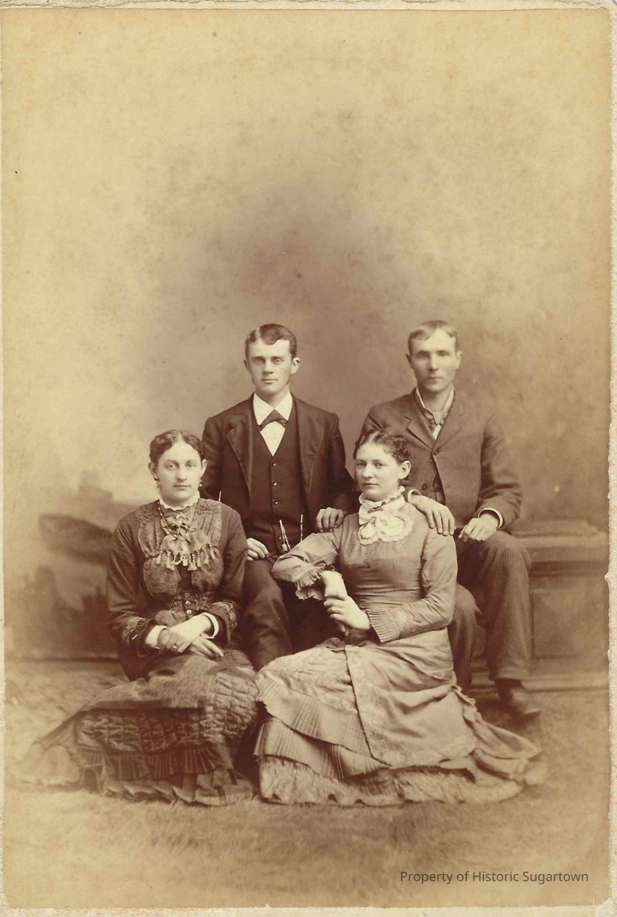Group photograph of (left to right) Flora DeEtta Hall (1858-1932), William Williams Jr. (1860-1935), Lulu Mabel Hall (1863-1937), and an unidentified man by Meadville, PA photographer A. R. Fowler.
