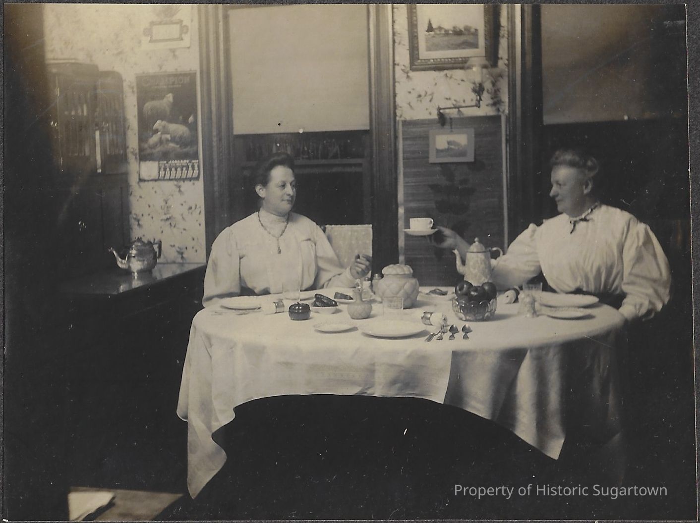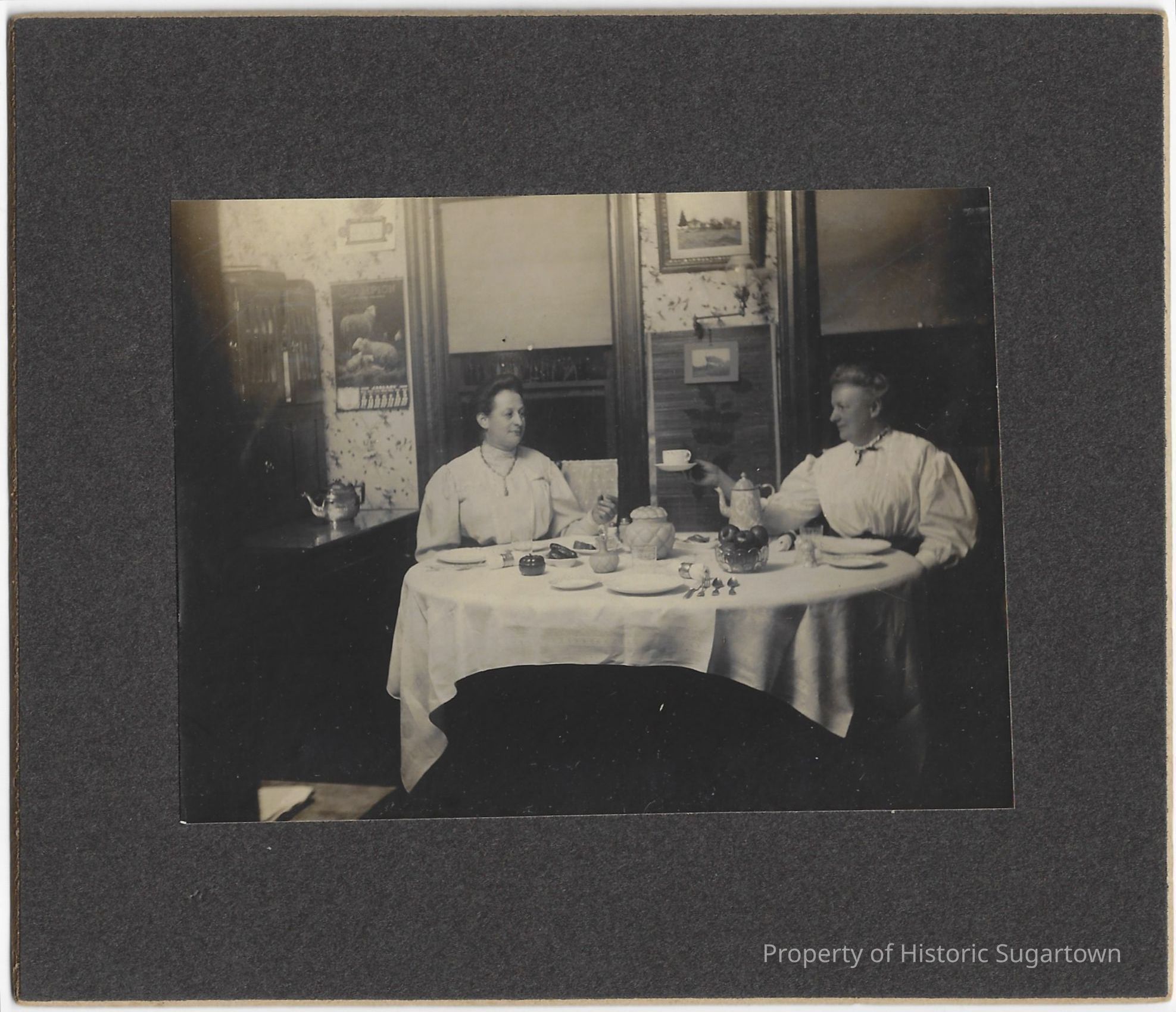 Sisters Flora DeEtta Hall (1858-1932) and Lulu Mabel Hall (1863-1937) having tea together, possibly in their shared home in Crawford County, PA.Collection