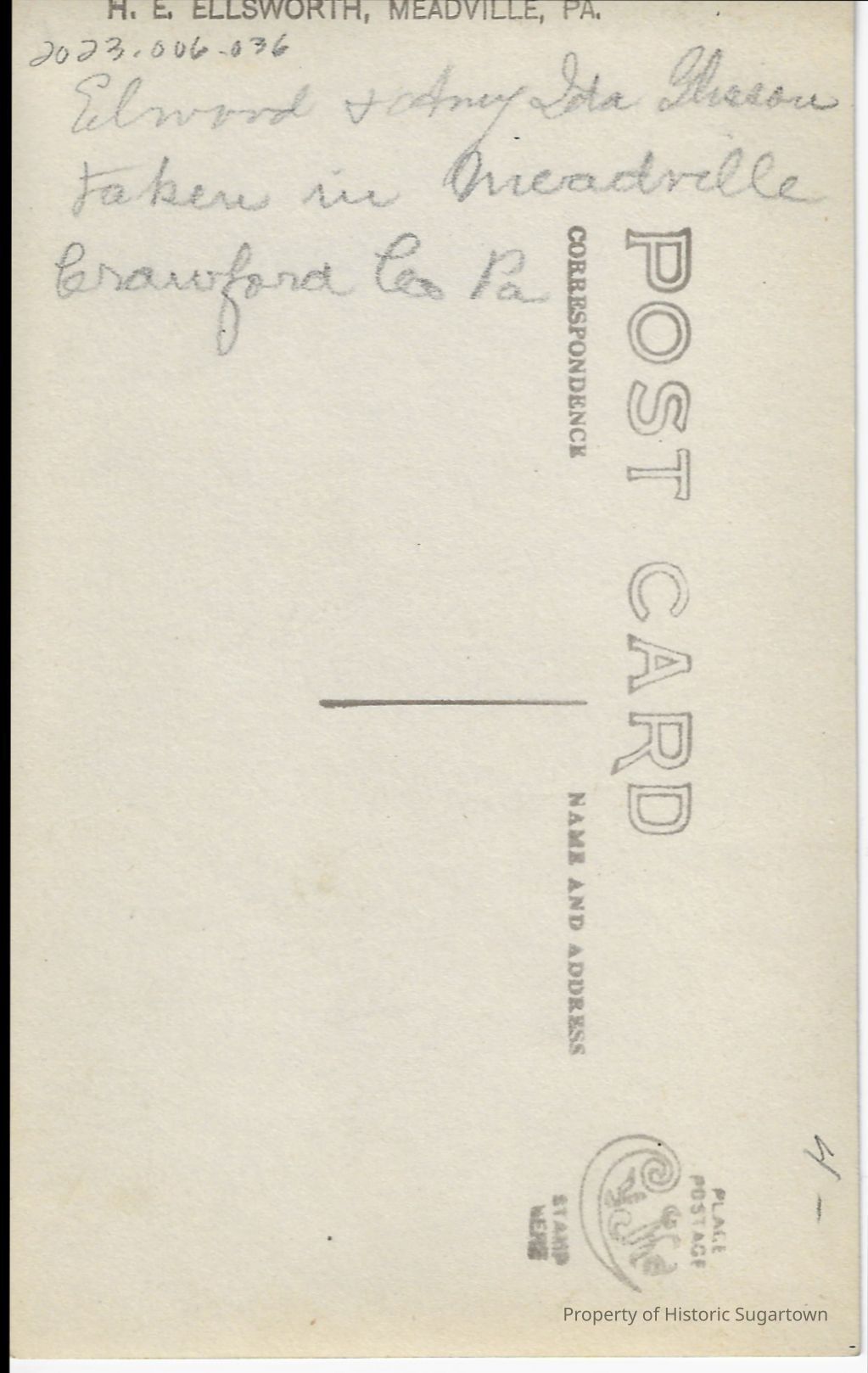 Real photo postcard (1907-1920s) photograph of Elwood Glisson (1855-1938) and Amy Ida Glisson (1857-1944) Postcard from Meadville, PA photographer Henry Edgarton Ellsworth's (1866-1954) studio. Ellsworth was the nephew of Amy Ida Glisson's aunt Rossana B. Smith Hall (1836-1905) on the Smith side.