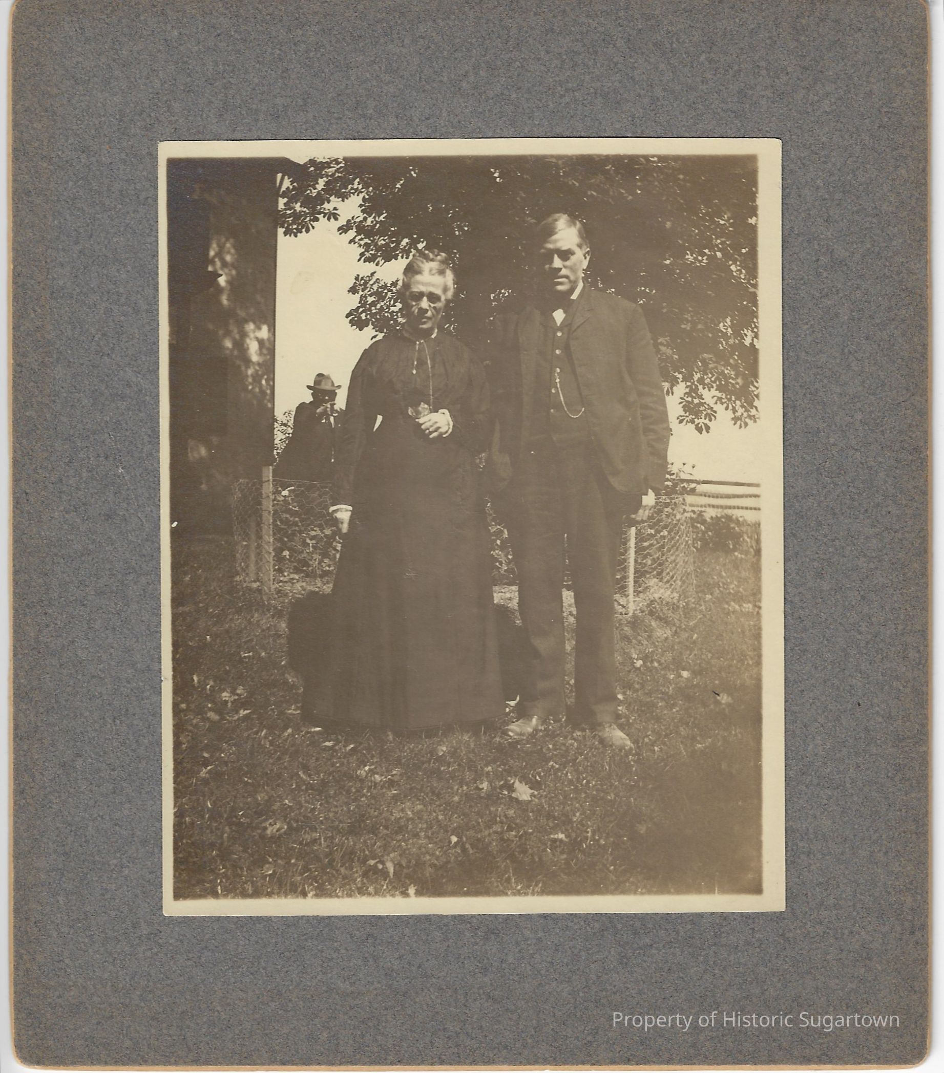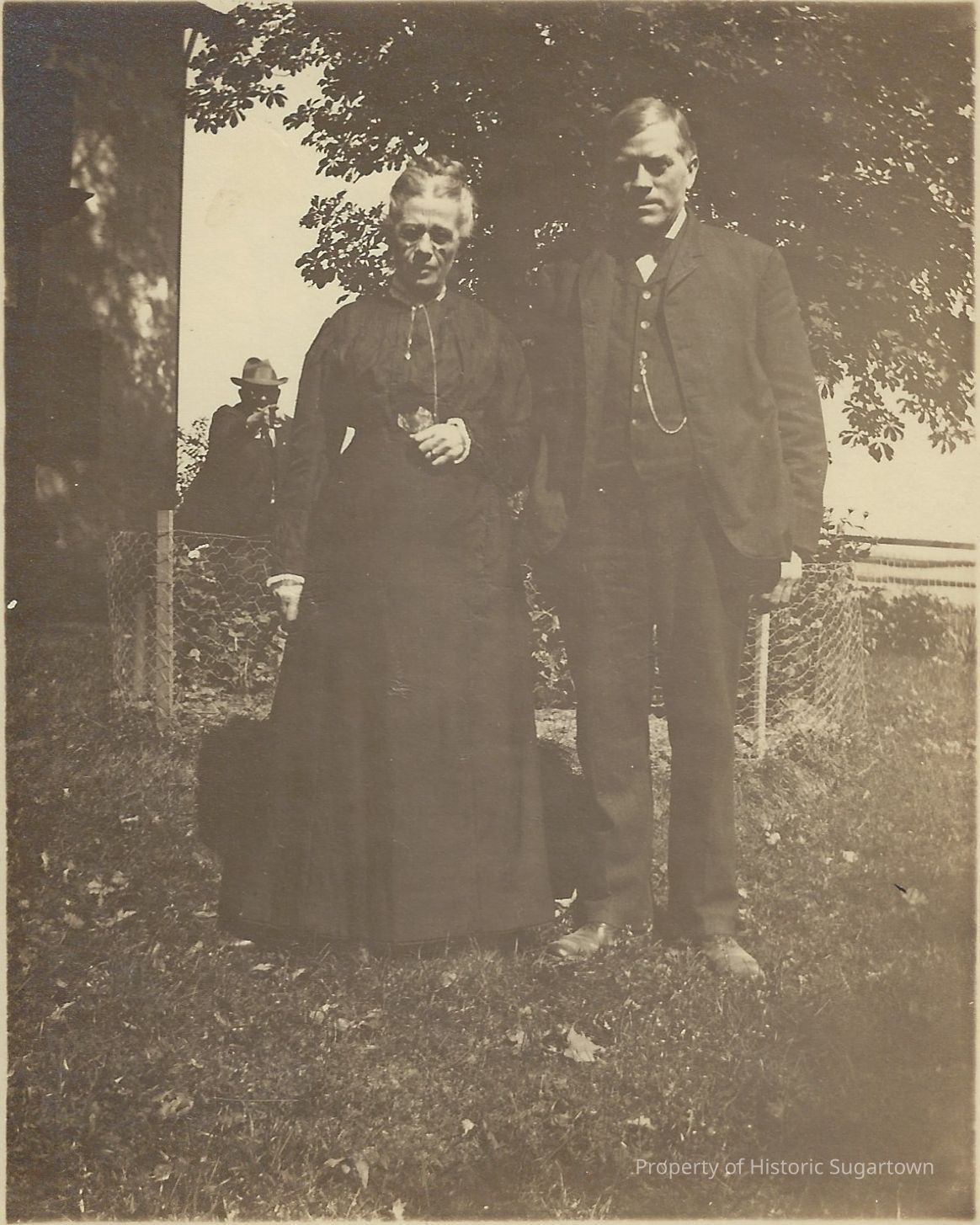 Photograph of Elwood (1855-1938) and Amy Ida Glisson (1857-1944), Harrie Edwards in the rear pointing his finger