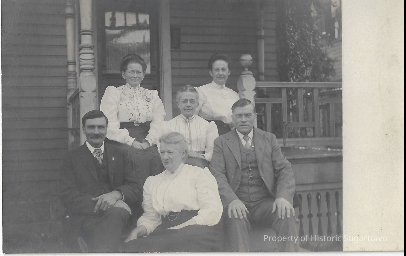 Real photo postcard photograph (1907-1920s) of Elwood Glisson (bottom right, 1855-1938), Amy Ida Williams Glisson (top middle, 1857-1944), Lulu Mabel Hall ("May Hall", bottom middle, 1863-1937), Flora DeEtta Hall ("Detta Hall", top right, 1858-1932), Harrie H. Brown (bottom left, 1879-1938), and Harriet ("Hattie") Wilcox Brown (top left, 1854-1926)