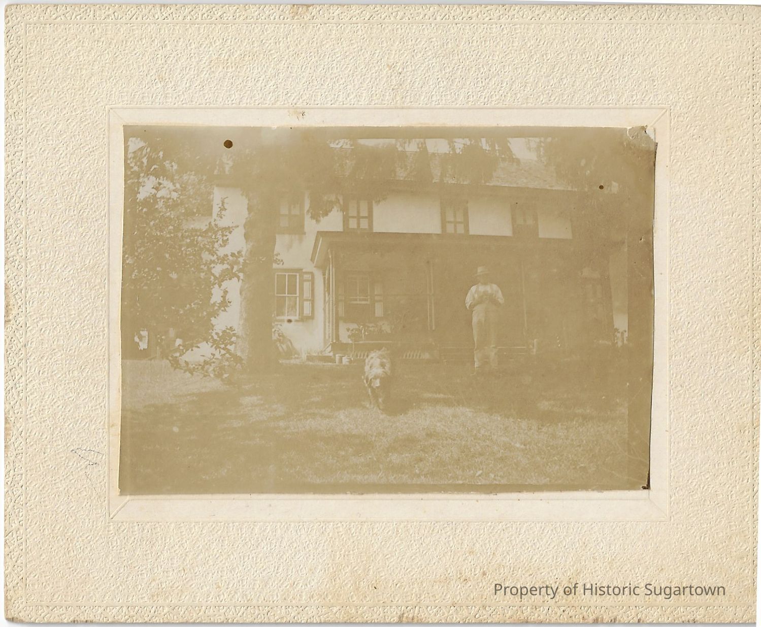 Photograph of Elwood Glisson (1855-1938), husband of Amy Ida Williams Glisson (1857-1944), and a dog in front of their home.