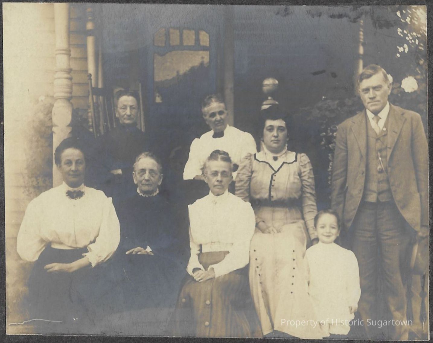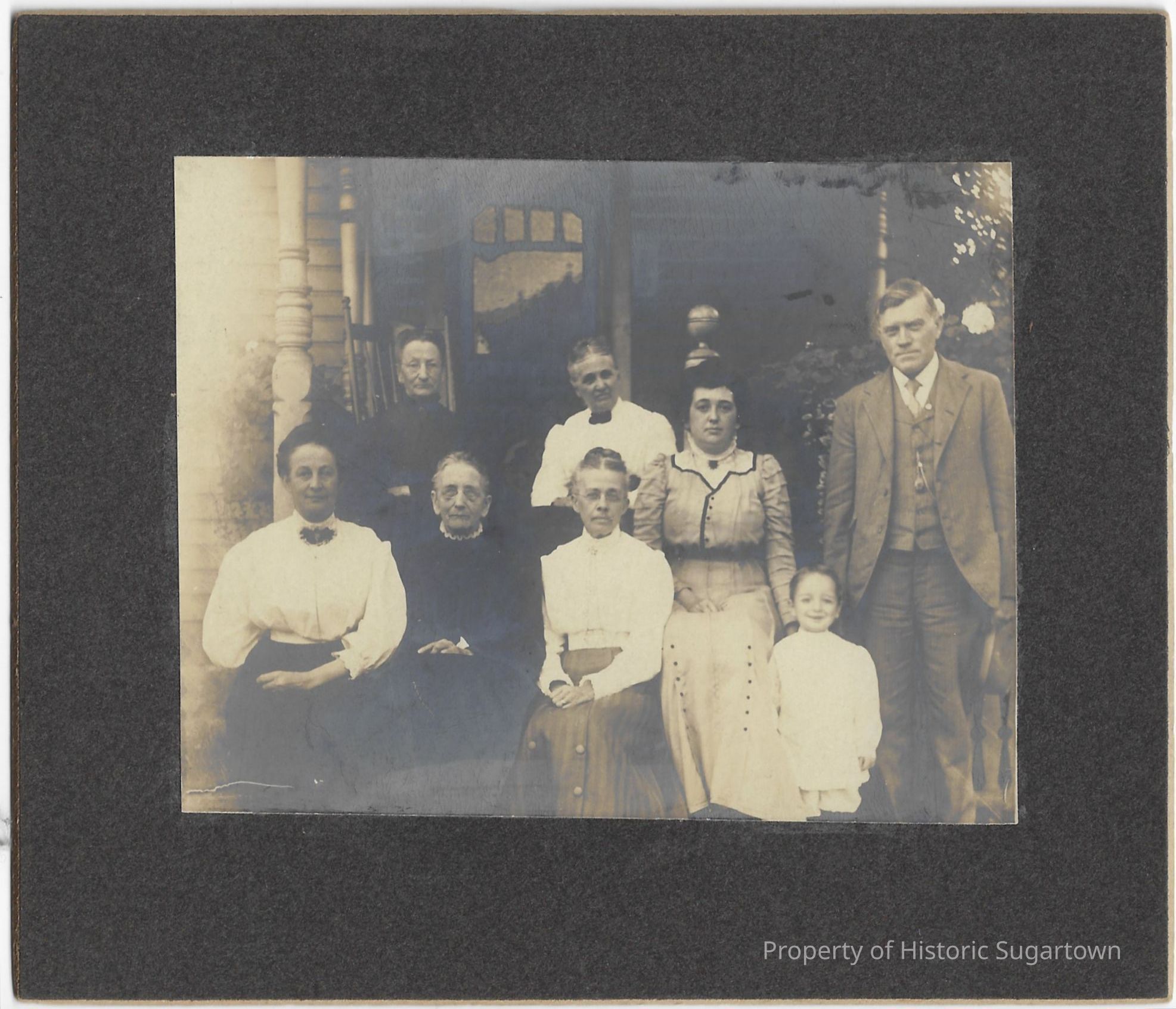 Group photograph taken on "Hall porch" (DeEtta and Mabel Hall's home, formerly Rosanna B. Smith Hall's home) (c. 1910), Meadville, PA 1909; Nora Leona Merriman Brown (1877-1937), Lewis Stanton Brown (1907-1941), Adaline "Addie" Smith Beatty (b. 1837), Sarah Wilcox (1832-1917), Flora DeEtta Hall (1858-1932), Lucy Ann Gaylord Scott ("Mrs. Scott", 1837-1929) Elwood Glisson (1855-1938), and Amy Ida Glisson (1857-1944).