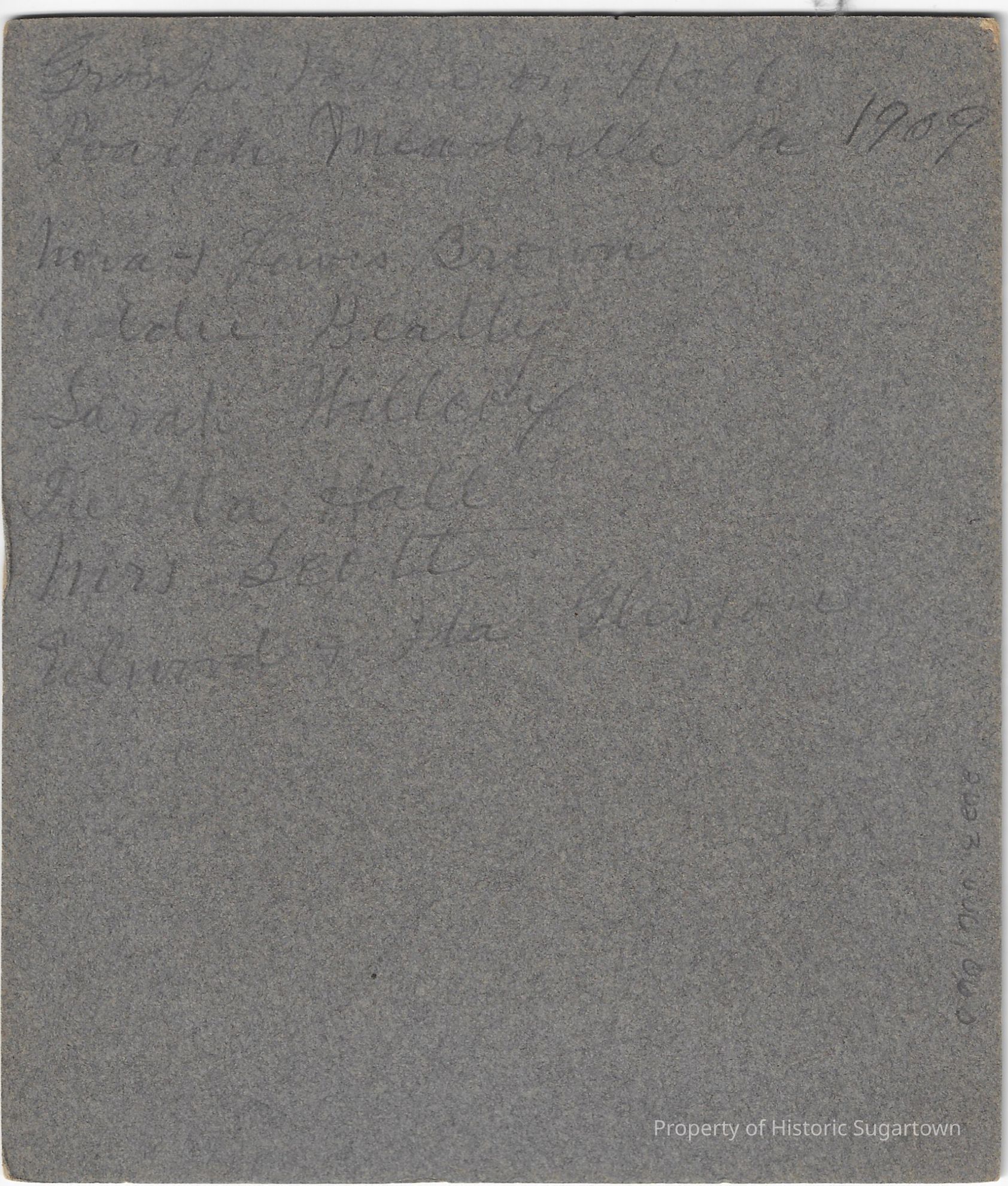 Local Families Photograph Collection/Group taken on Hall porch, Meadville PA 1909; Nora and Lewis Brown, Addie Beatty, Sarah Wilcox, Detta Hall, Mrs. Scott, Elwood and Amy Ida GlissonEntry/Object ID