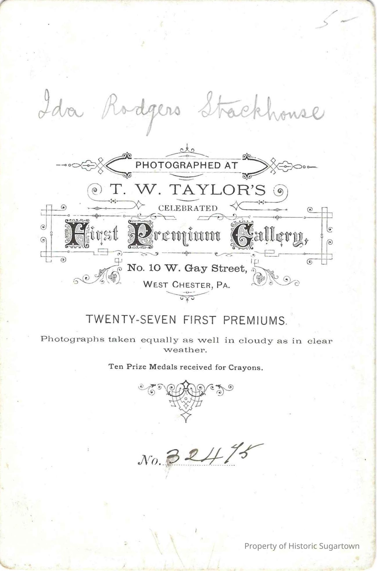 Cabinet card photograph of Ida Rodgers Stackhouse by West Chester, PA photographer Thomas W. Taylor at Taylor's First Premium Gallery, No. 10 West Gay Street, West Chester, PA.