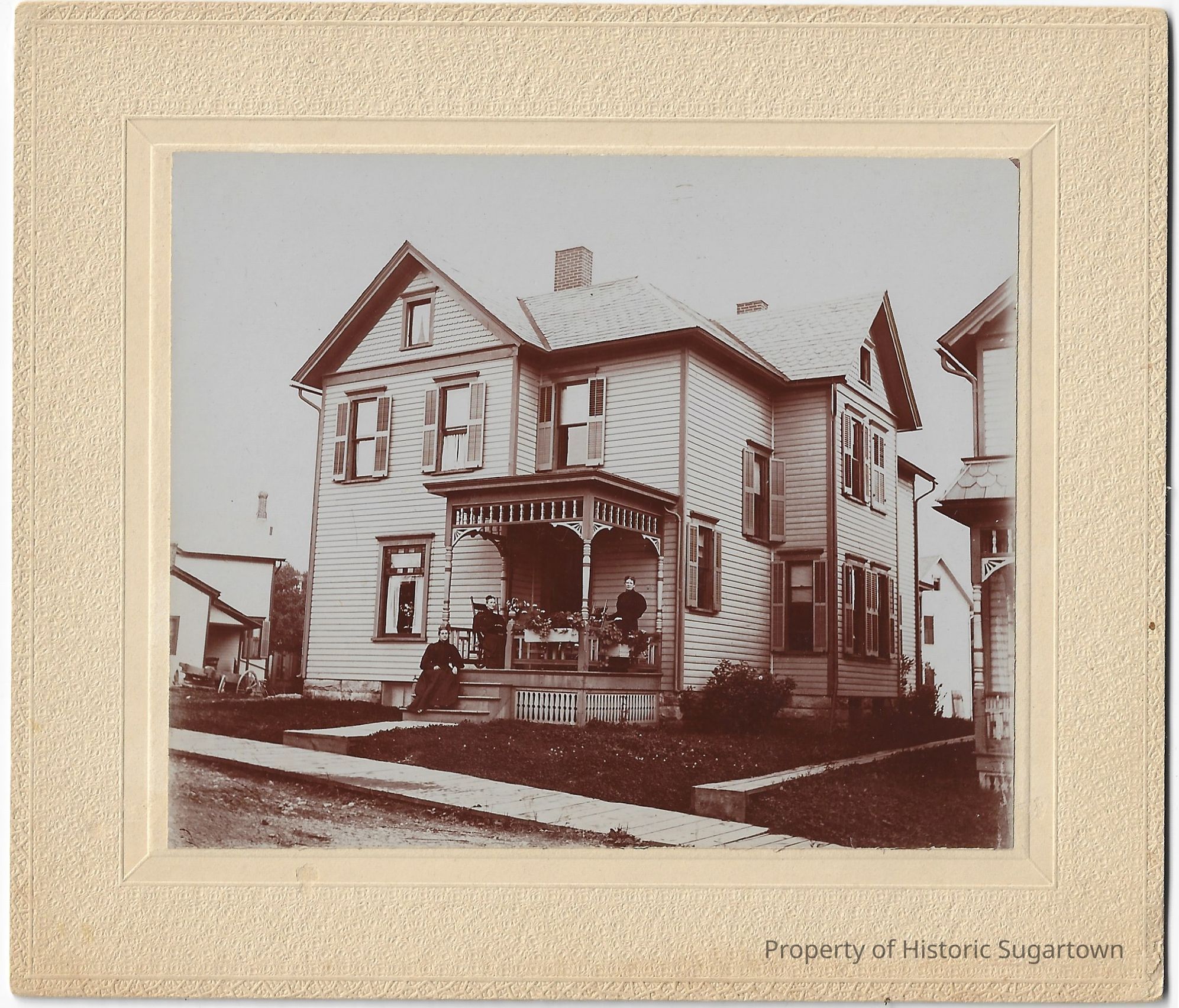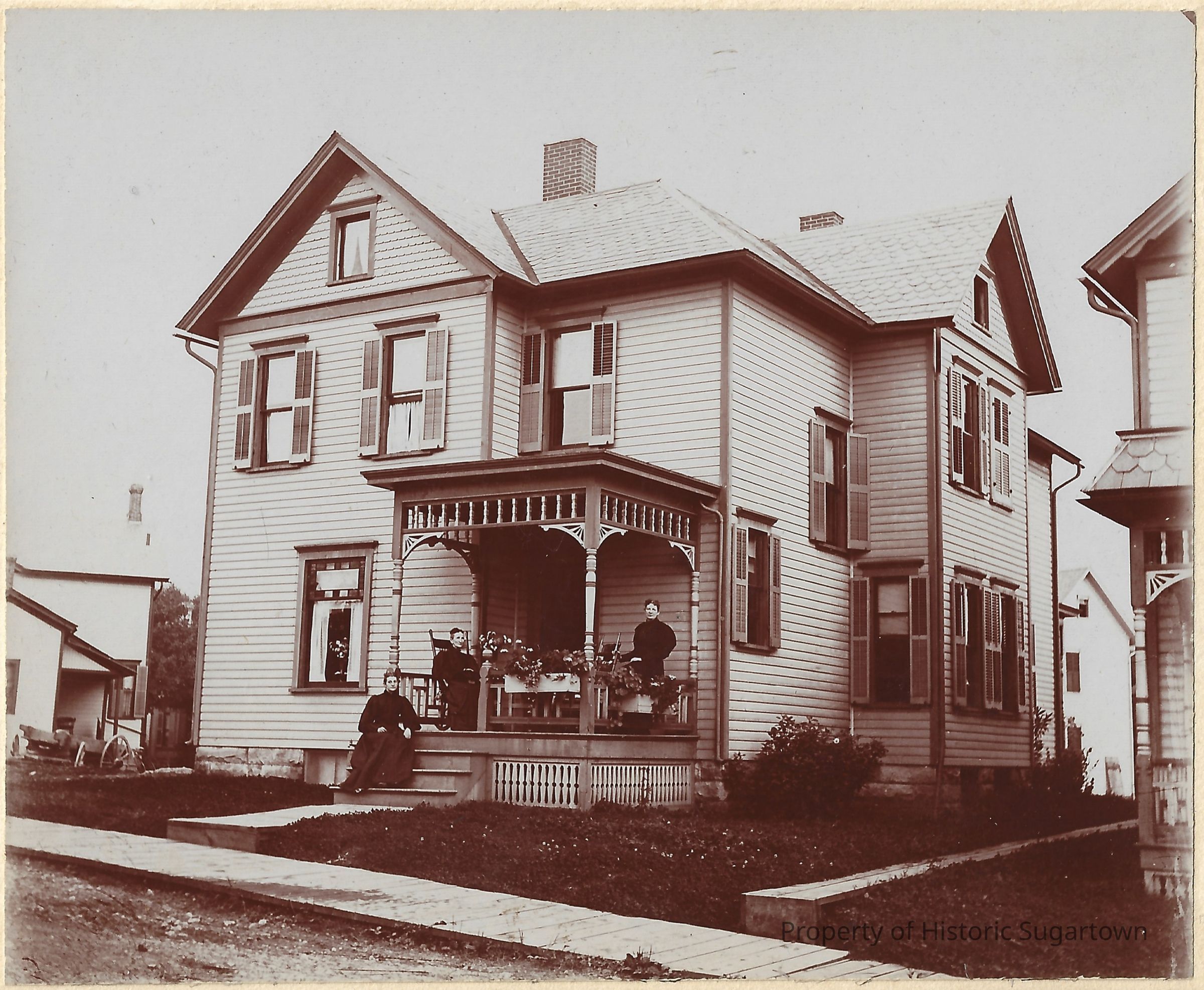 Photograph of three unidentified women on the porch of Rosanna B. Smith Hall (1836-1905, middle), mother of Flora DeEtta Hall (1858-1932) and her siblings and aunt of Amy Ida Williams Glisson (1857-1944) and her siblings, at her house in Meadville, PA. The women could be Rosanna's sisters and/or daughters.