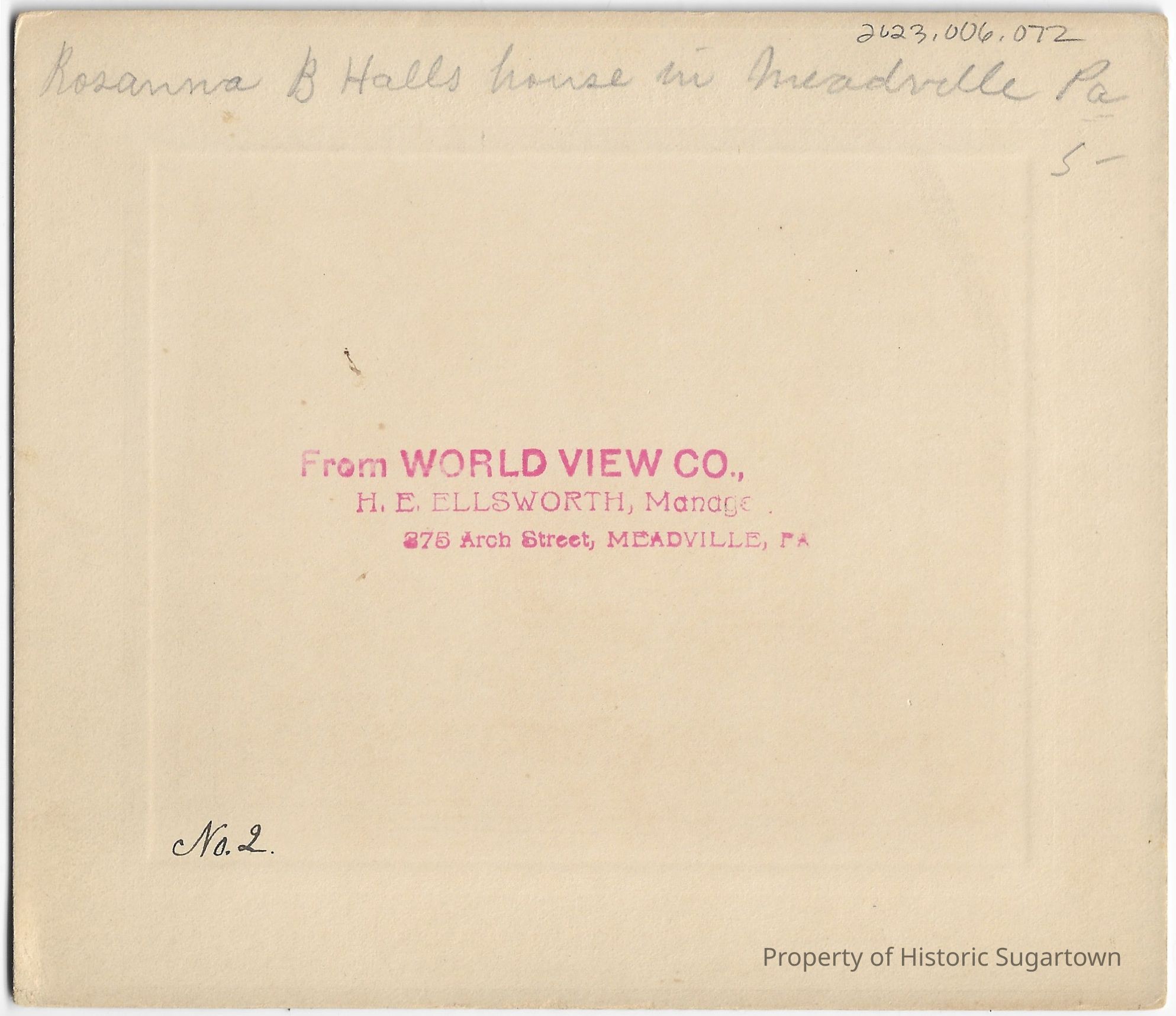 The back of the photograph has branding from World View Co. at 375 Arch Street, Meadville, PA, a photography studio owned or managed by Rosanna's nephew, Henry Edgarton Ellsworth (1866-1954).Collection