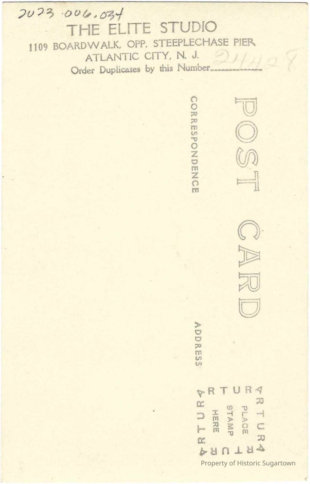 Real photo postcard photograph (1910-1924) of unidentified woman, possibly Elizabeth Williams (1858-1936), from The Elite Studio at 1109 Boardwalk, Opp. Steeplechase Pier, Atlantic City, NJ.