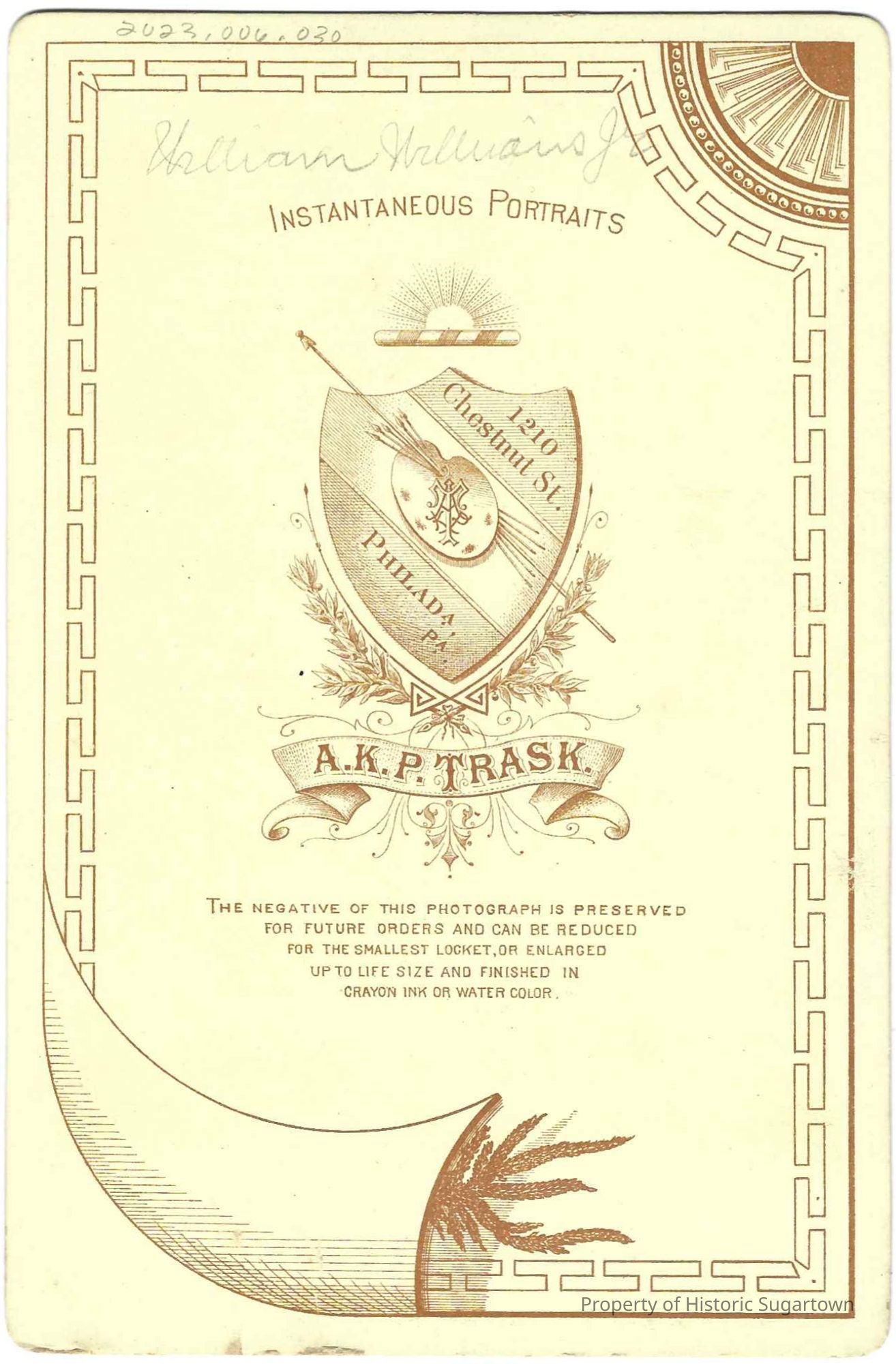 Cabinet card photograph of William Williams Jr. (1860-1935), son of William Williams Sr. (1824-1886) and Amy H. Williams (1823-1889), by Philadelphia photographer Albion K. P. Trask (1831-1900).