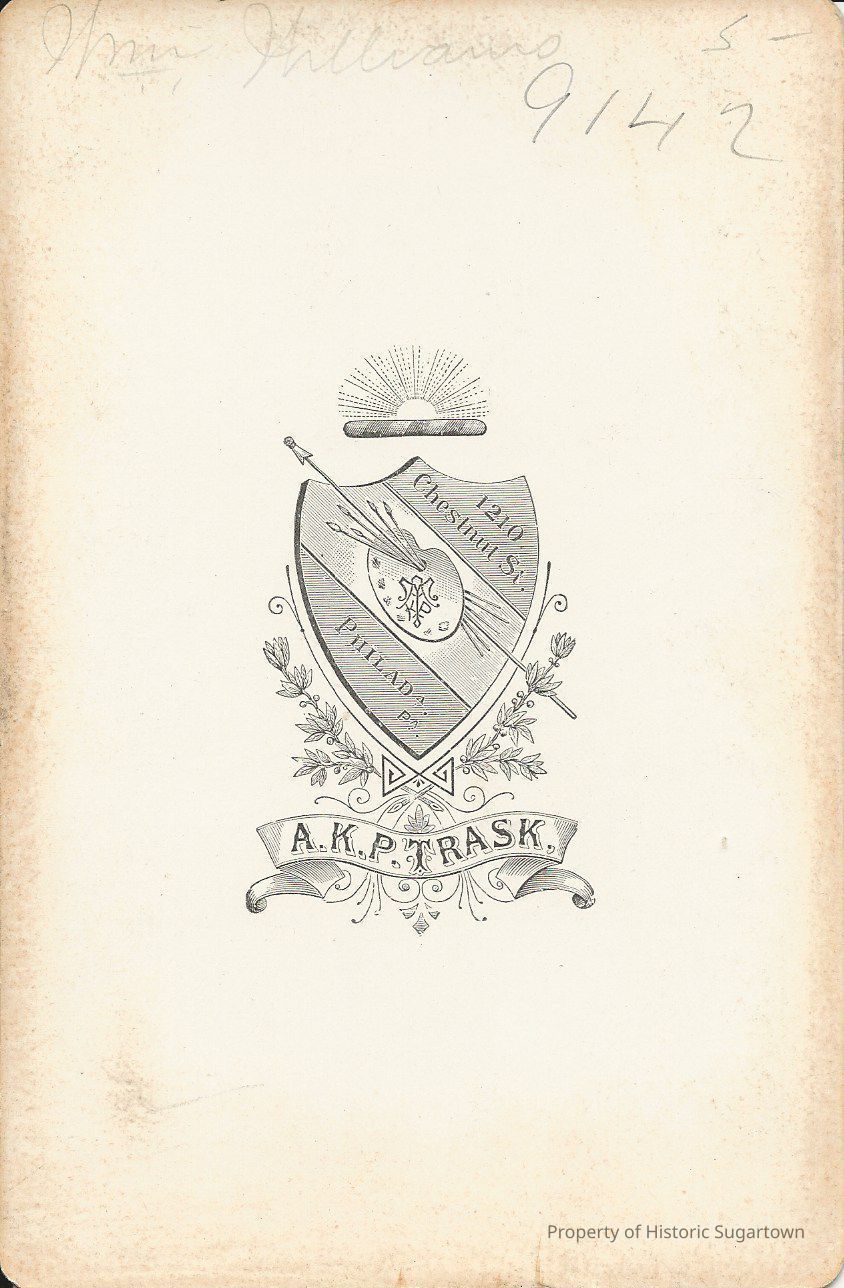 Photograph of William Williams Jr. (1860-1935), circa 1880, son of William Williams Sr. (1824-1886) and Amy H. Williams (1823-1889), by Philadelphia photographer Albion K. P. Trask (1831-1900). The 1210 Chestnut St., Philadelphia, PA address indicates it was produced between 1879 and 1891.Collection