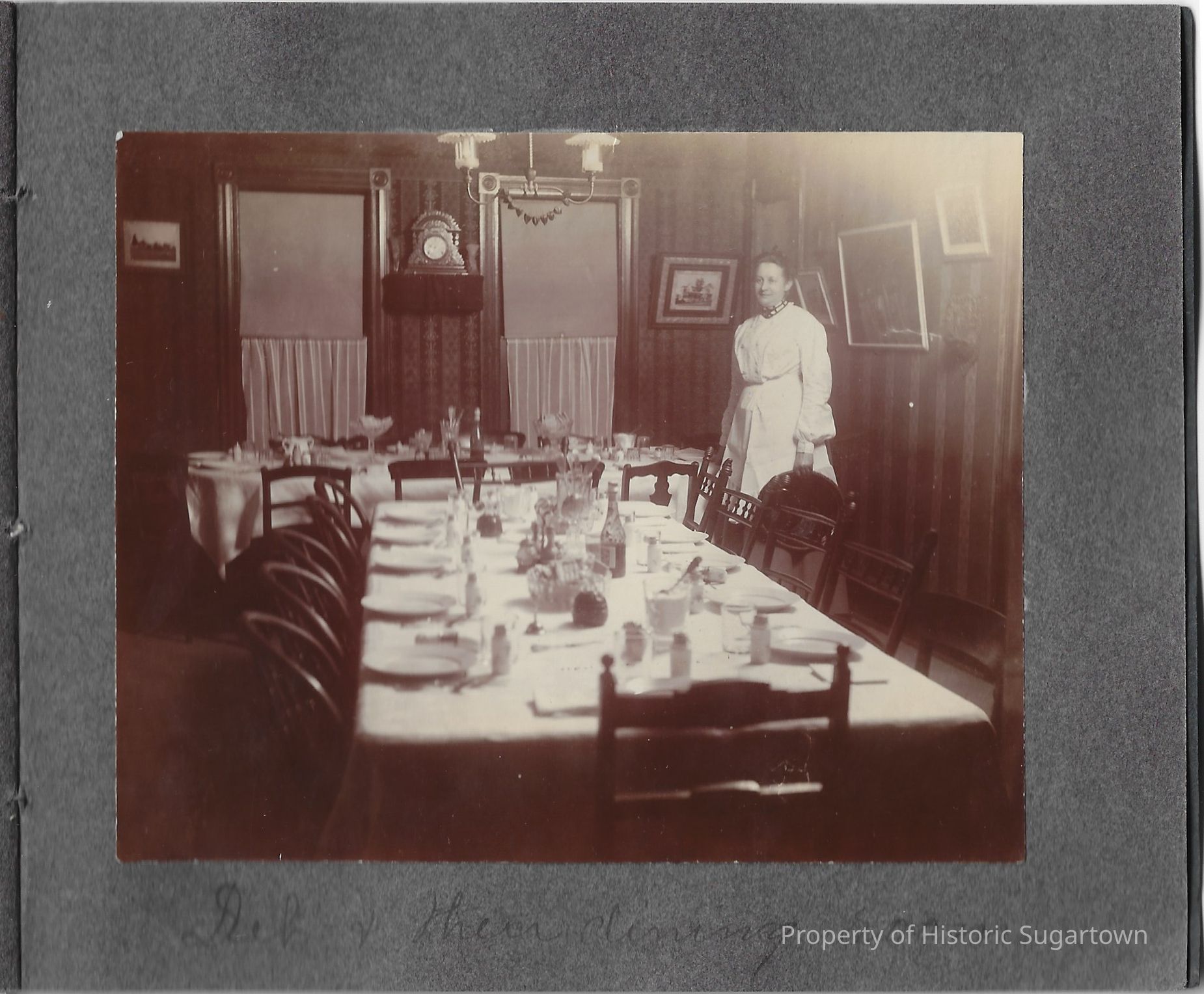 Photograph of Flora DeEtta Hall (1858-1932) labeled "Det and their Dining Room." "Their" may refer to the dining room in the home inhabited by DeEtta and her mother and sister, Rosanna B. Smith Hall (1836-1905) and Lulu Mabel Hall (1863-1937). "Their" could also refer to the unidentified building featured in the photograph on the previous page of the album (see: 2023.006.090).
