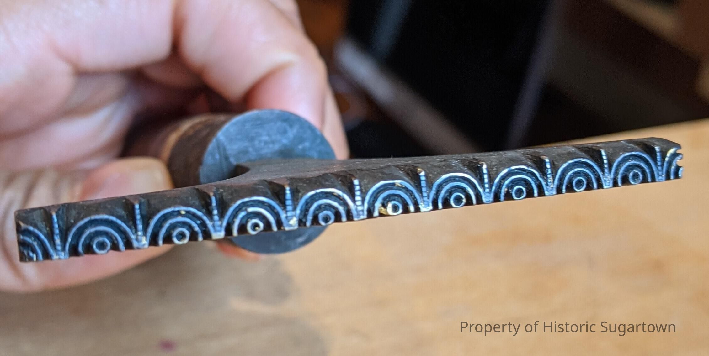 "Long stamp with arch pattern. Handle is lightly singed."-Adelaide Okonski