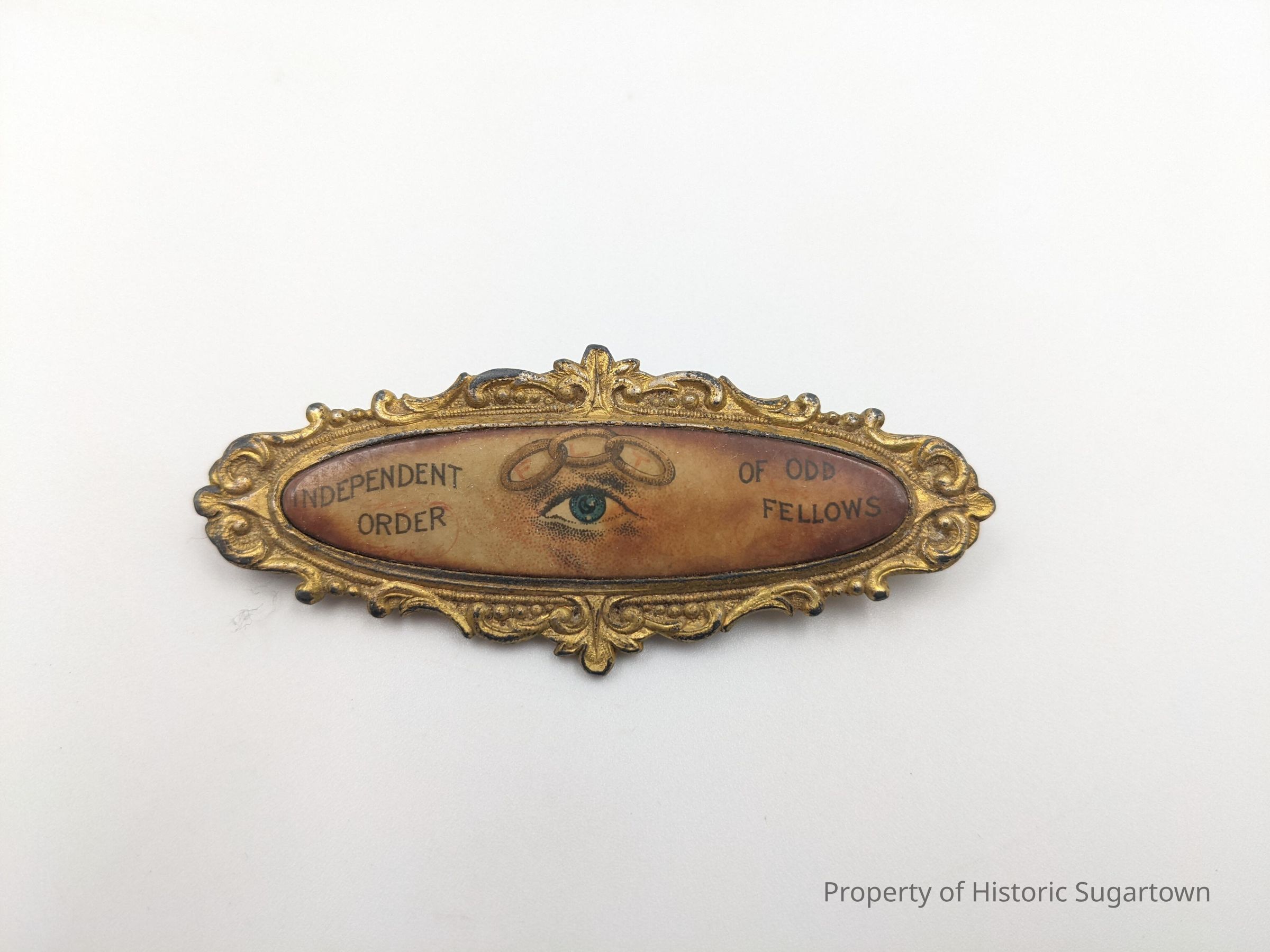 Independent Order of the Odd Fellow Brooch. This one was found at an antique shop in Montana. Donated to Historic Sugartown to help interpret the Odd Fellows HallCataloged By