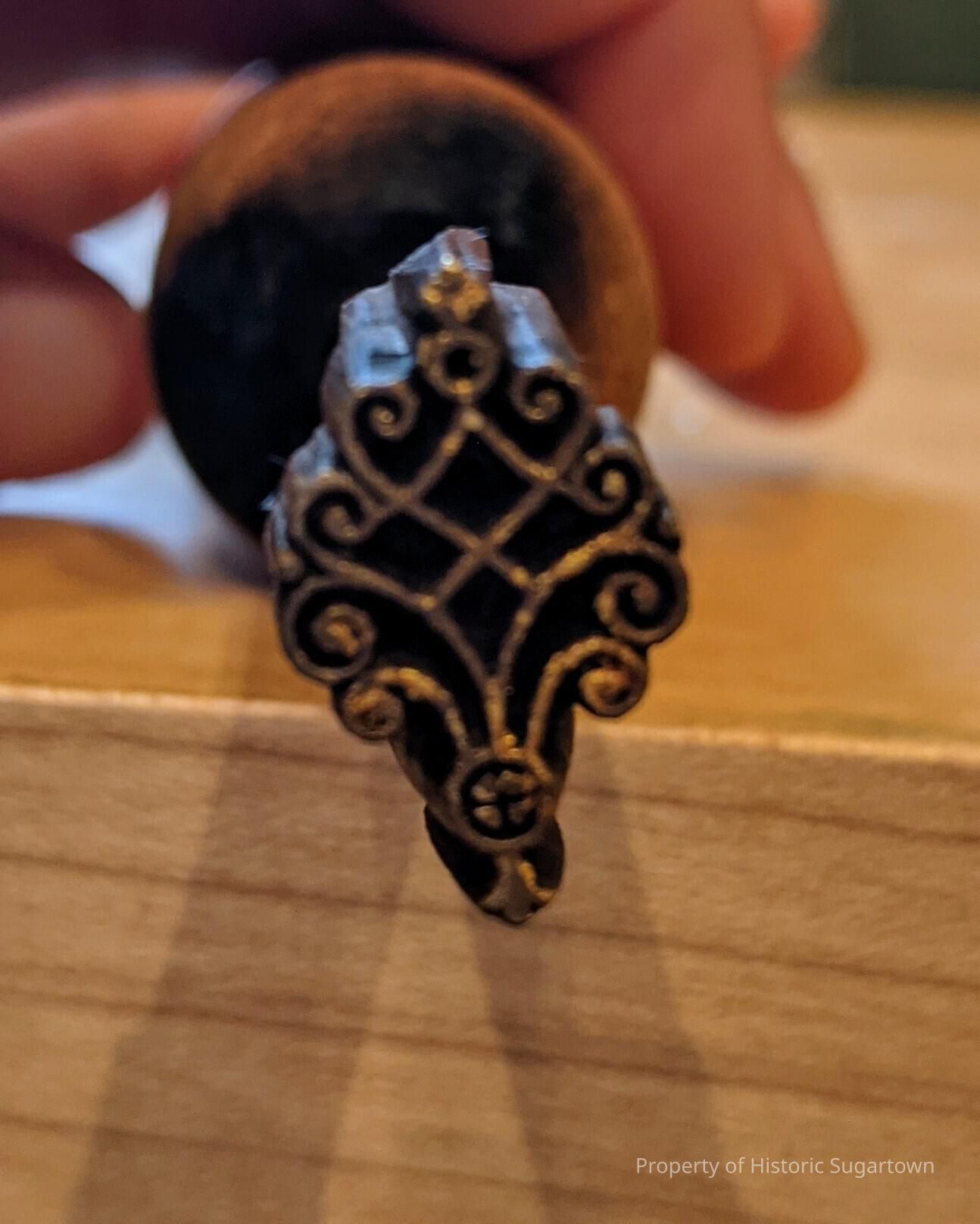 "Criss cross pattern in an oblong oval like shape, slightly singed handle."- Adelaide Okonski. Oval fleur-dis-lis design.