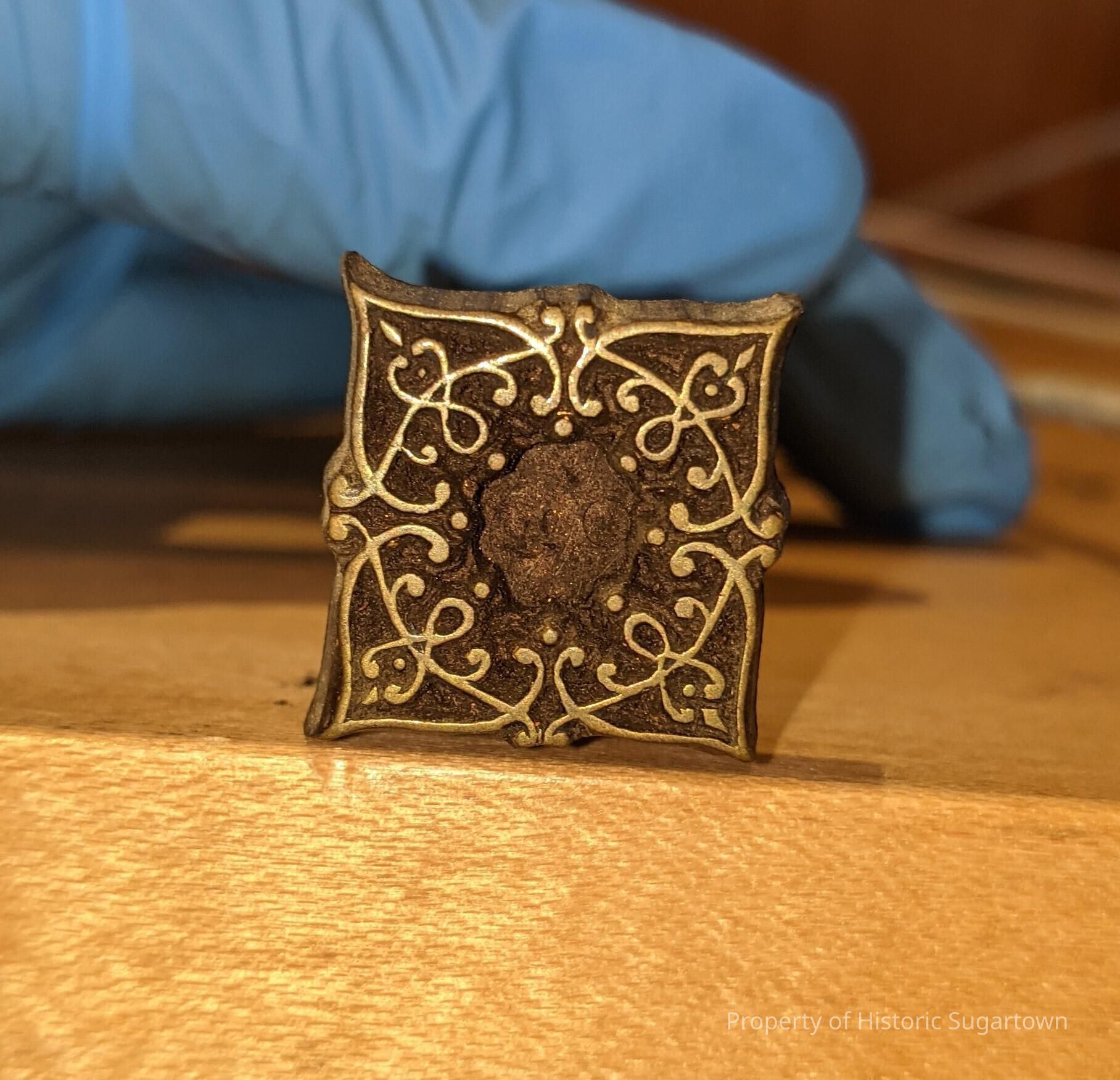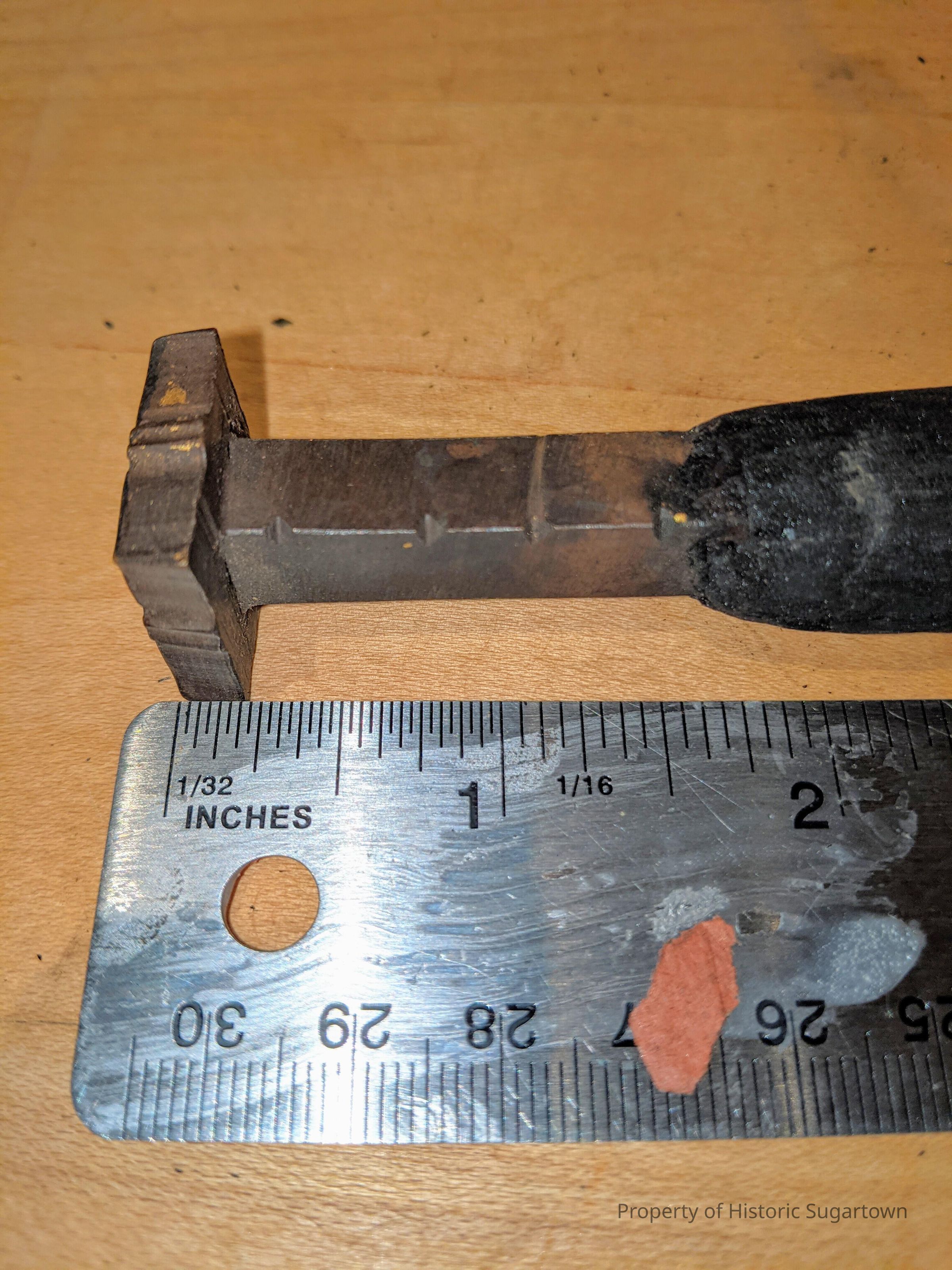 Hand stamp with an Italian/Venetian face. Square shaped with scroll work.