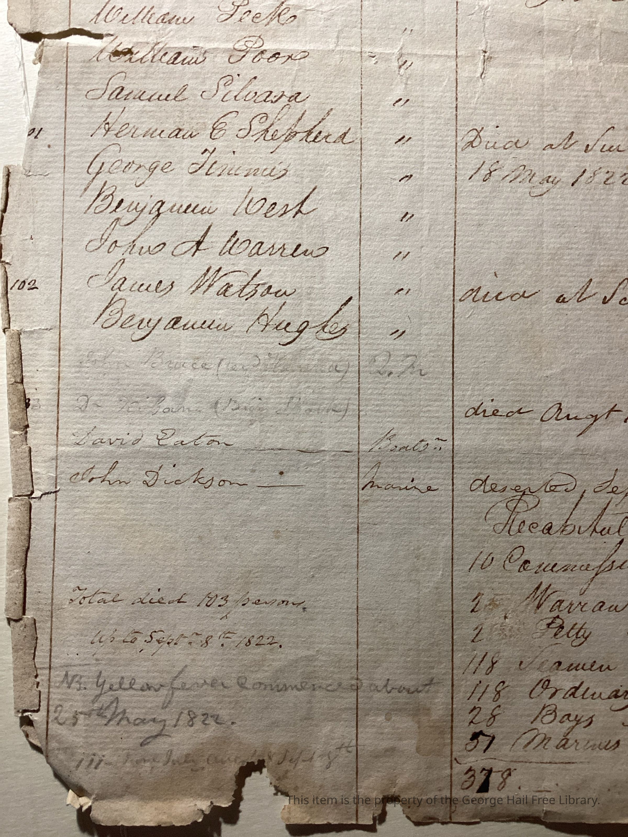 A partial listing of crew members, rank, and date/place of death due to yellow fever. “Total died 103 persons up to Sept. 8th 1822.”Context