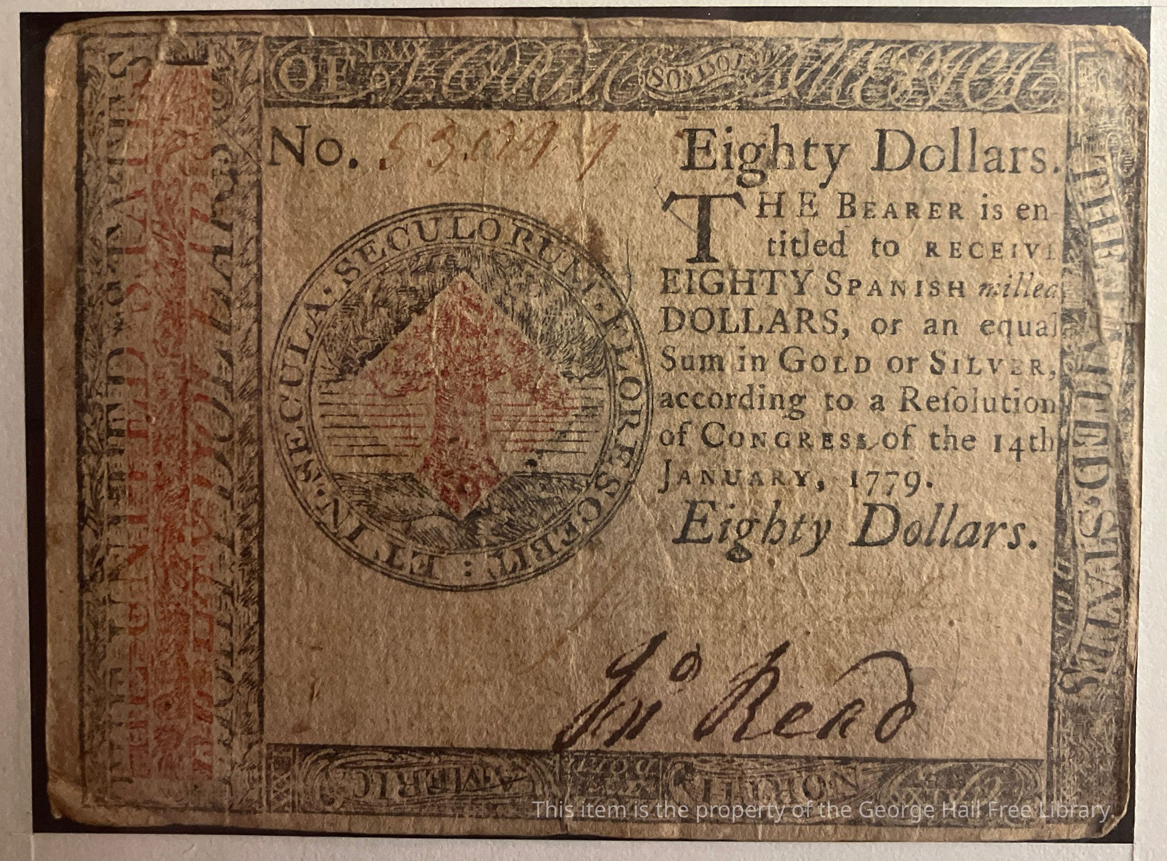 The central block includes a handwritten number for this specific bill, and the original handwritten signature of John Read, but the usual second signature has worn off— only a ghost remains. A statement says, “The bearer is entitled to receive eighty Spanish milled dollars, or an equivalent in gold or silver, according to a Resolution of Congress of the 14th January, 1779.” That date means the bill was issued in that year.