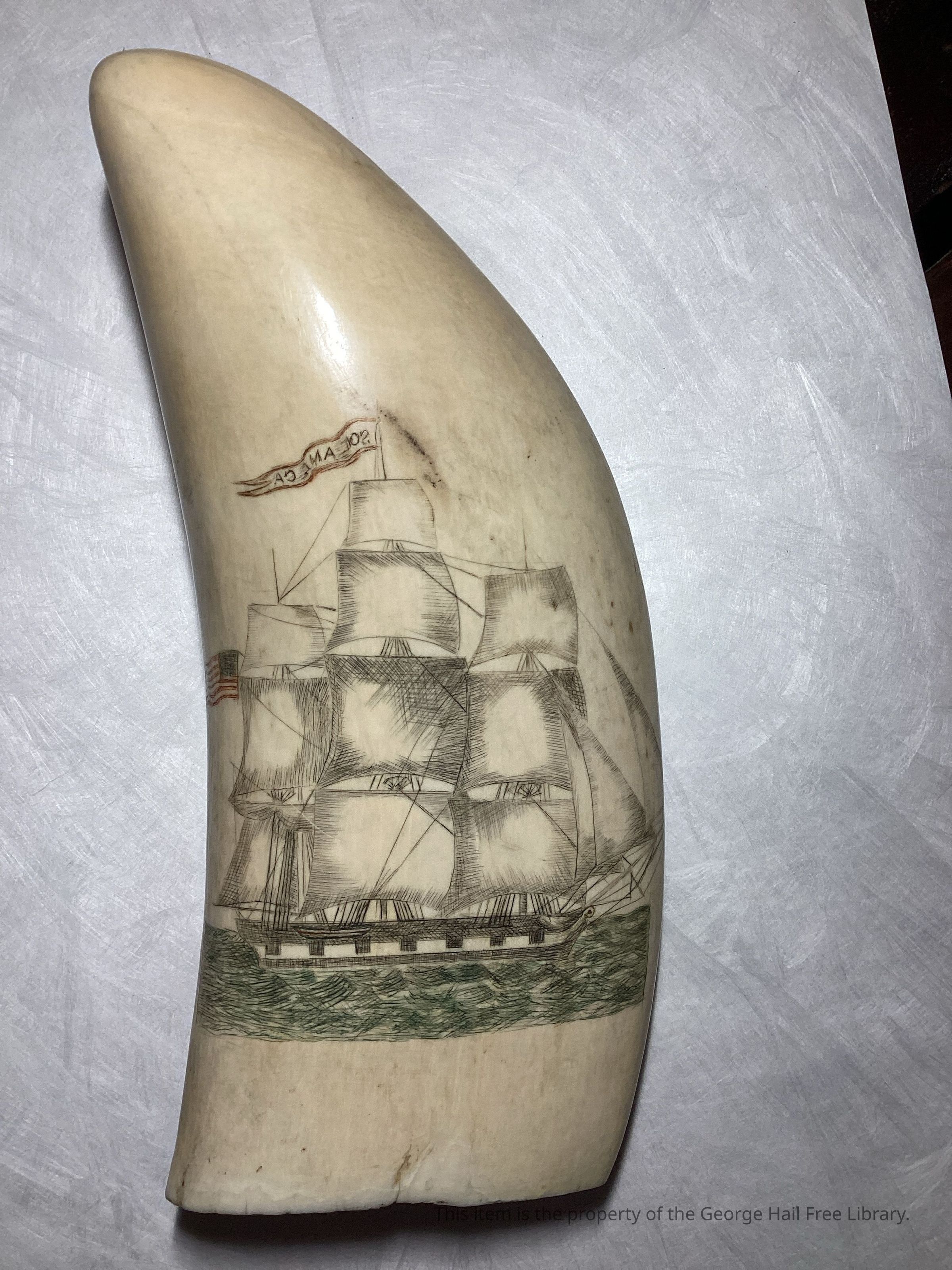Scrimshaw is scrollwork, engravings, and carvings done in bone, ivory, or whale products such as teeth and baleen. Typically it refers to the artwork created by whalers, engraved on the byproducts of whales. It is most commonly made out of the bones and teeth of sperm whales, the baleen of other whales, and the tusks of walruses. It takes the form of elaborate engravings in the form of pictures and lettering on the surface of the bone or tooth, with the engraving highlighted using a pigment, or, less often, small sculptures made from the same material. (Some content from Wikipedia: https://en.wikipedia.org/wiki/Scrimshaw)