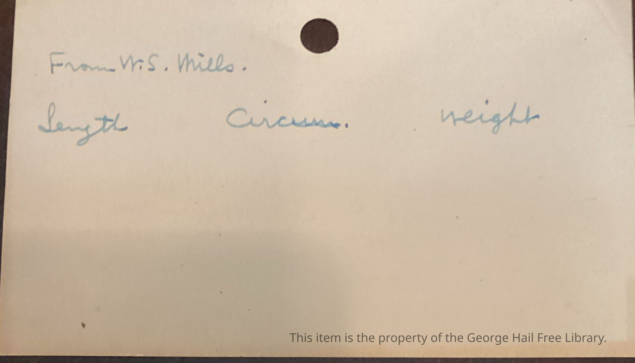 Card found in Historical Card Catalog indicates item was given by W.S. Mills. No date provided.Research Notes