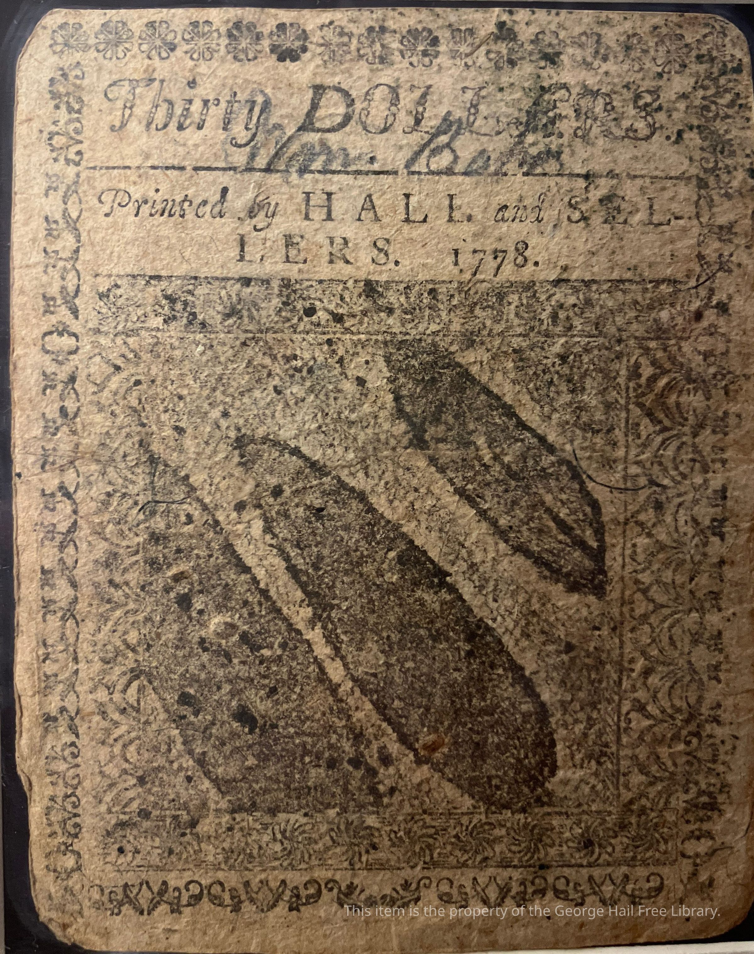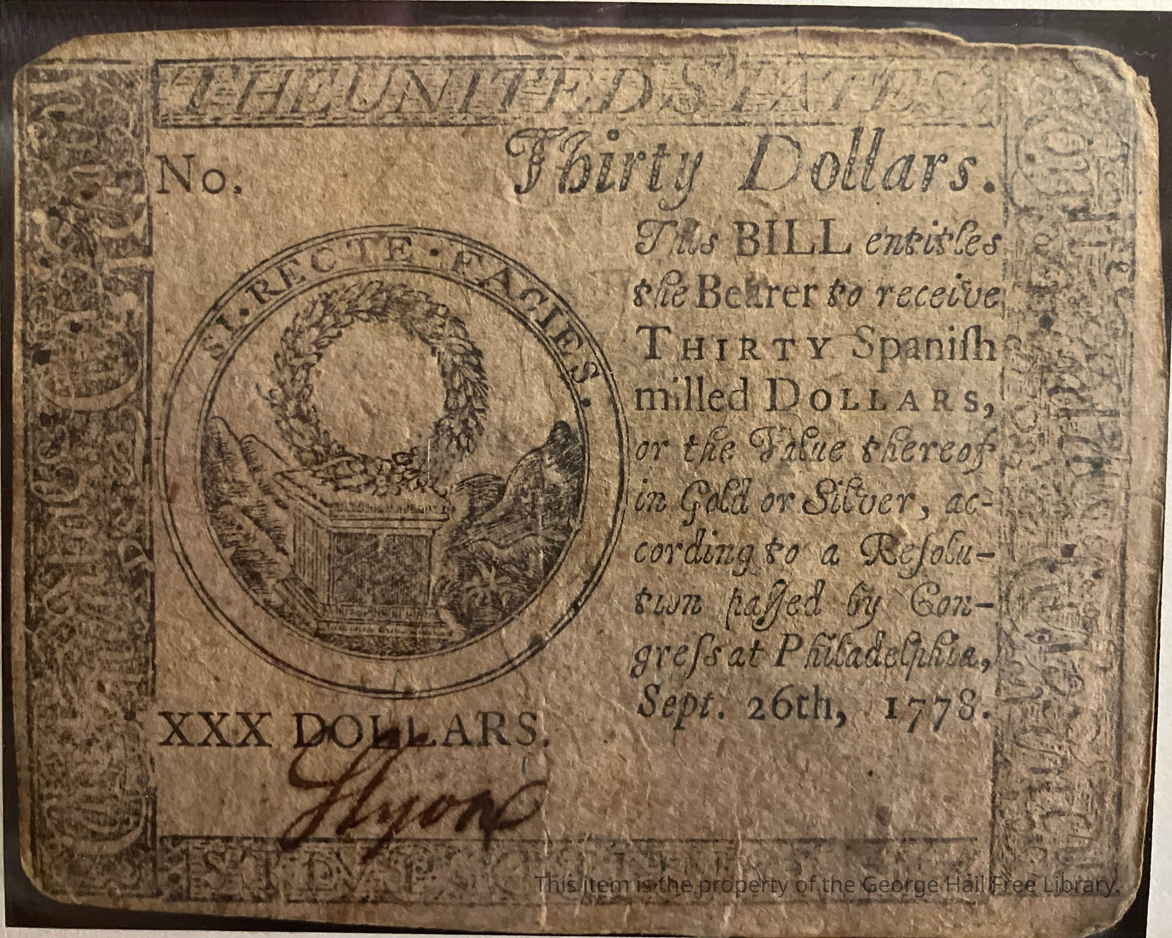 The bearer is entitled to receive thirty Spanish milled dollars, or an equivalent in gold or silver, according to a Resolution of Congress at Philadelphia, Sept.26, 1778Lexicon