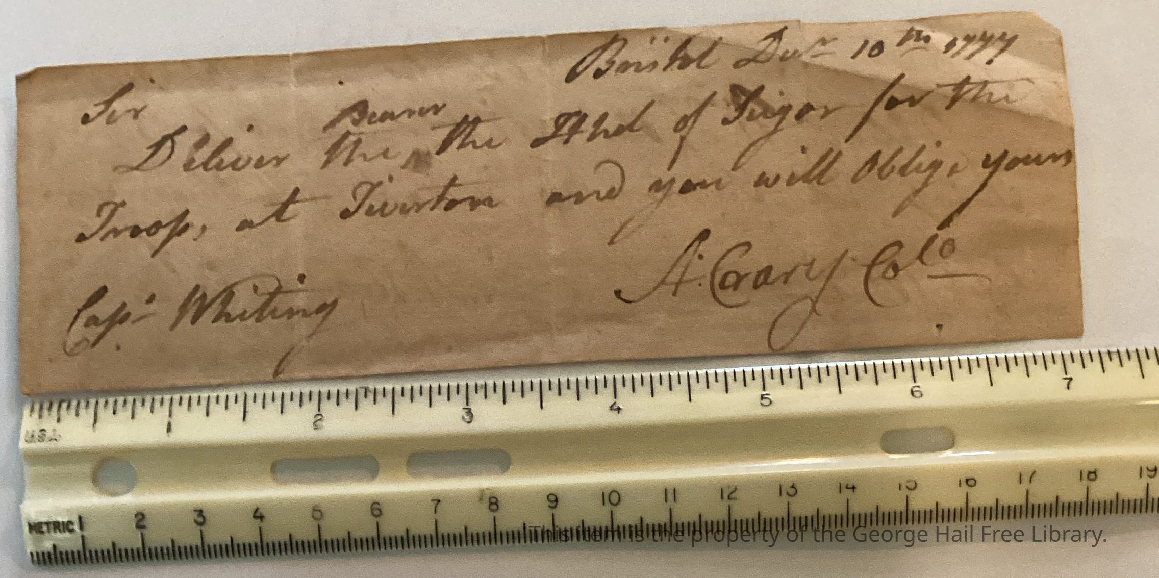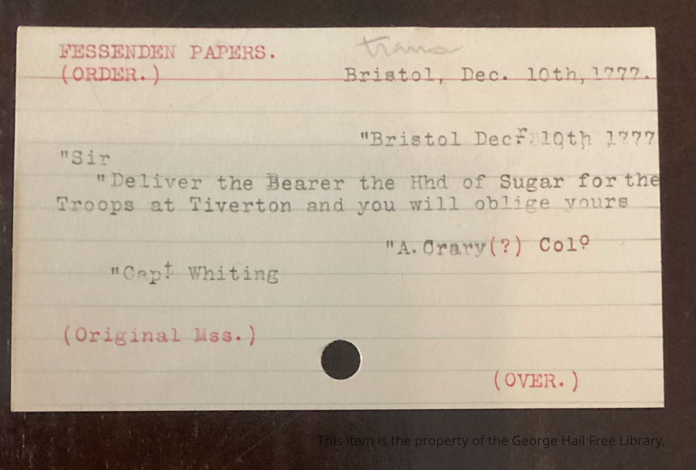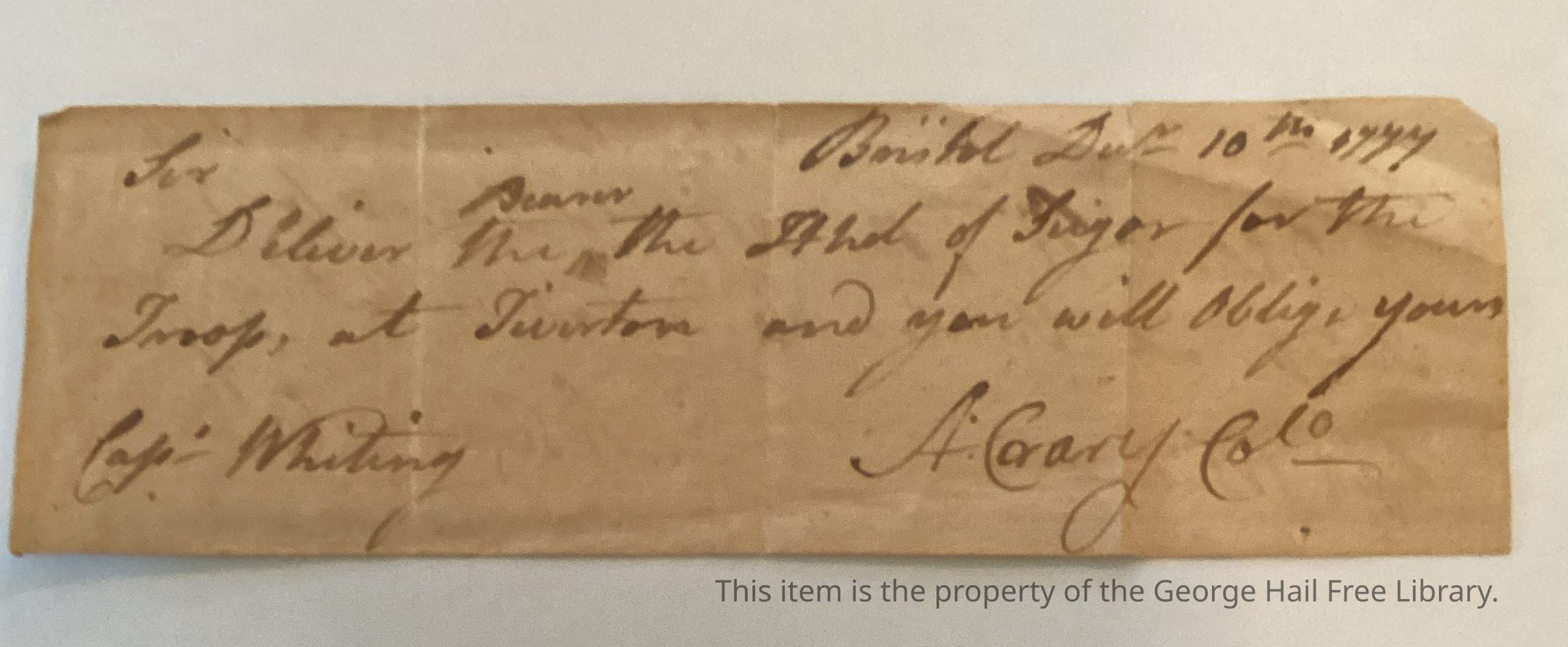 Receipt records delivery of sugar to Capt. Whiting by Colonel Crary for military troops in Tiverton.Context