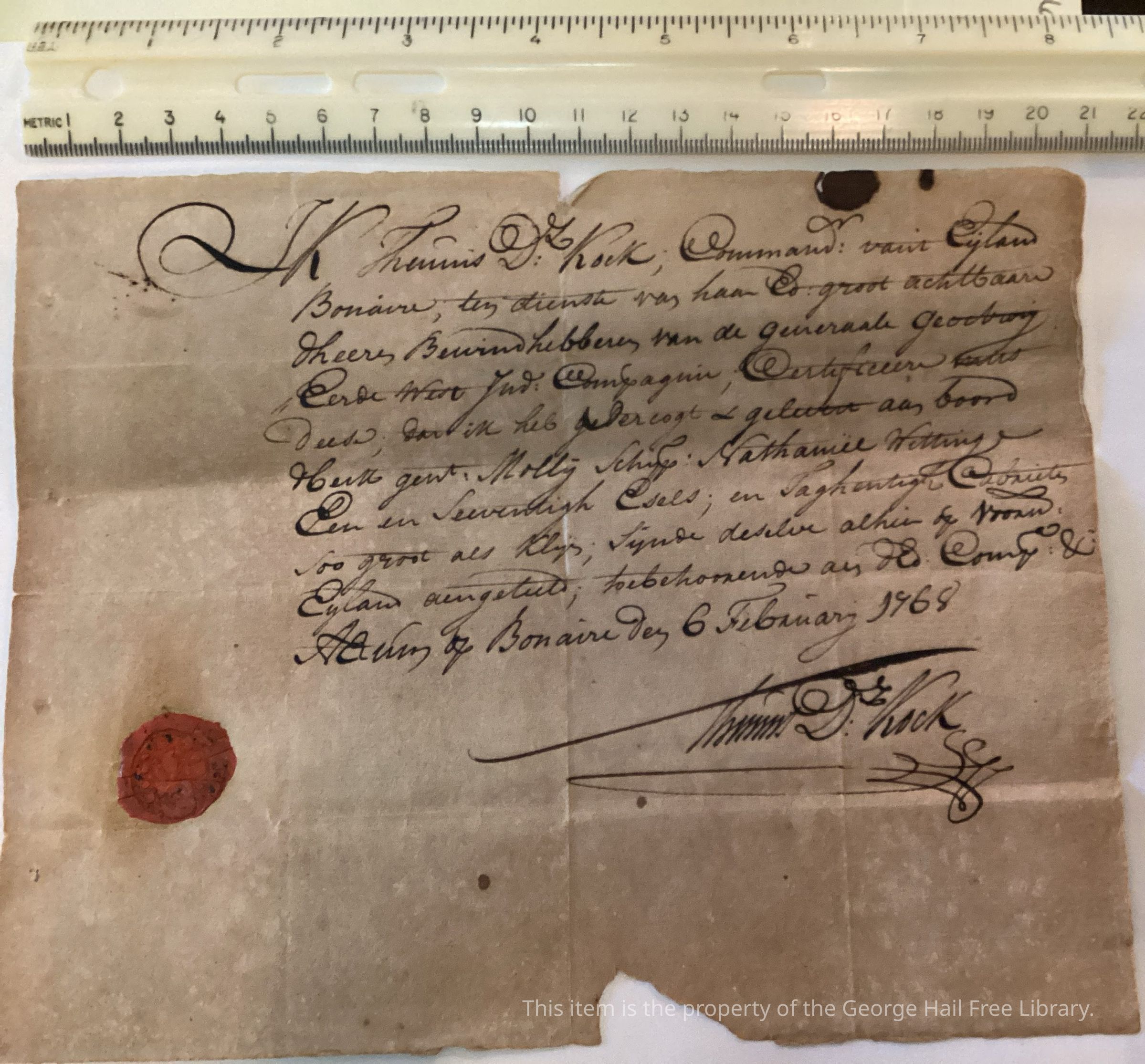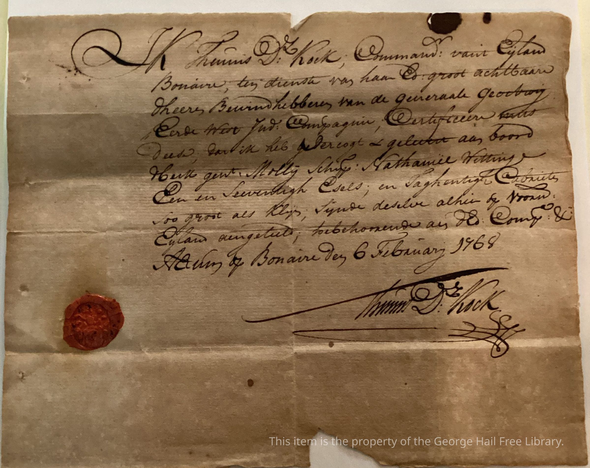 Letter was written in Dutch and signed by Thomas D Kock. The letter mentions the island of Bonaire, a Caribbean island located near Aruba off the coast of Venezuela. The island is a municipality of the Netherlands and had, during the 1700's, a population that mostly consisted of slaves and salt farm workers who worked under the Dutch West India Company.Lexicon