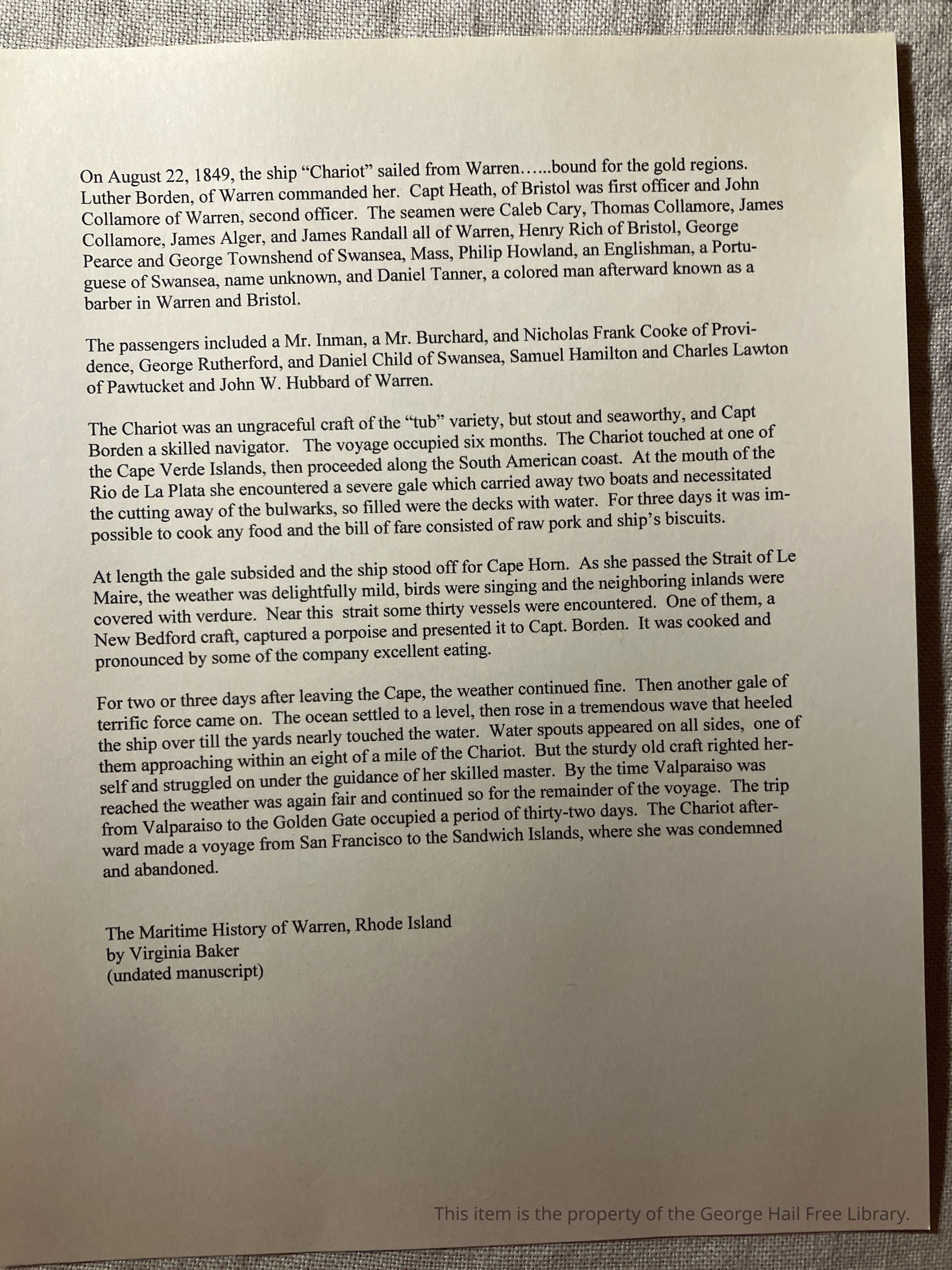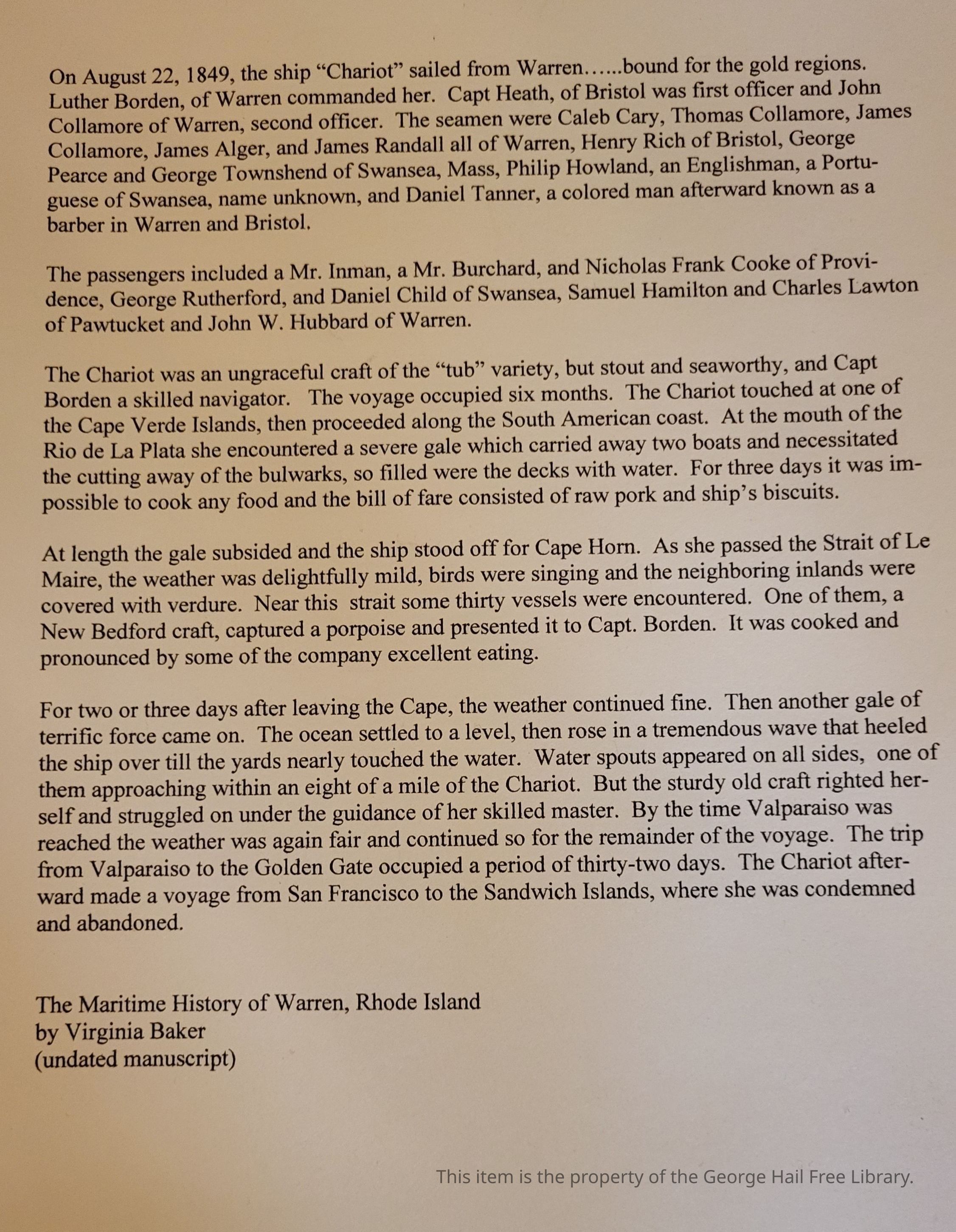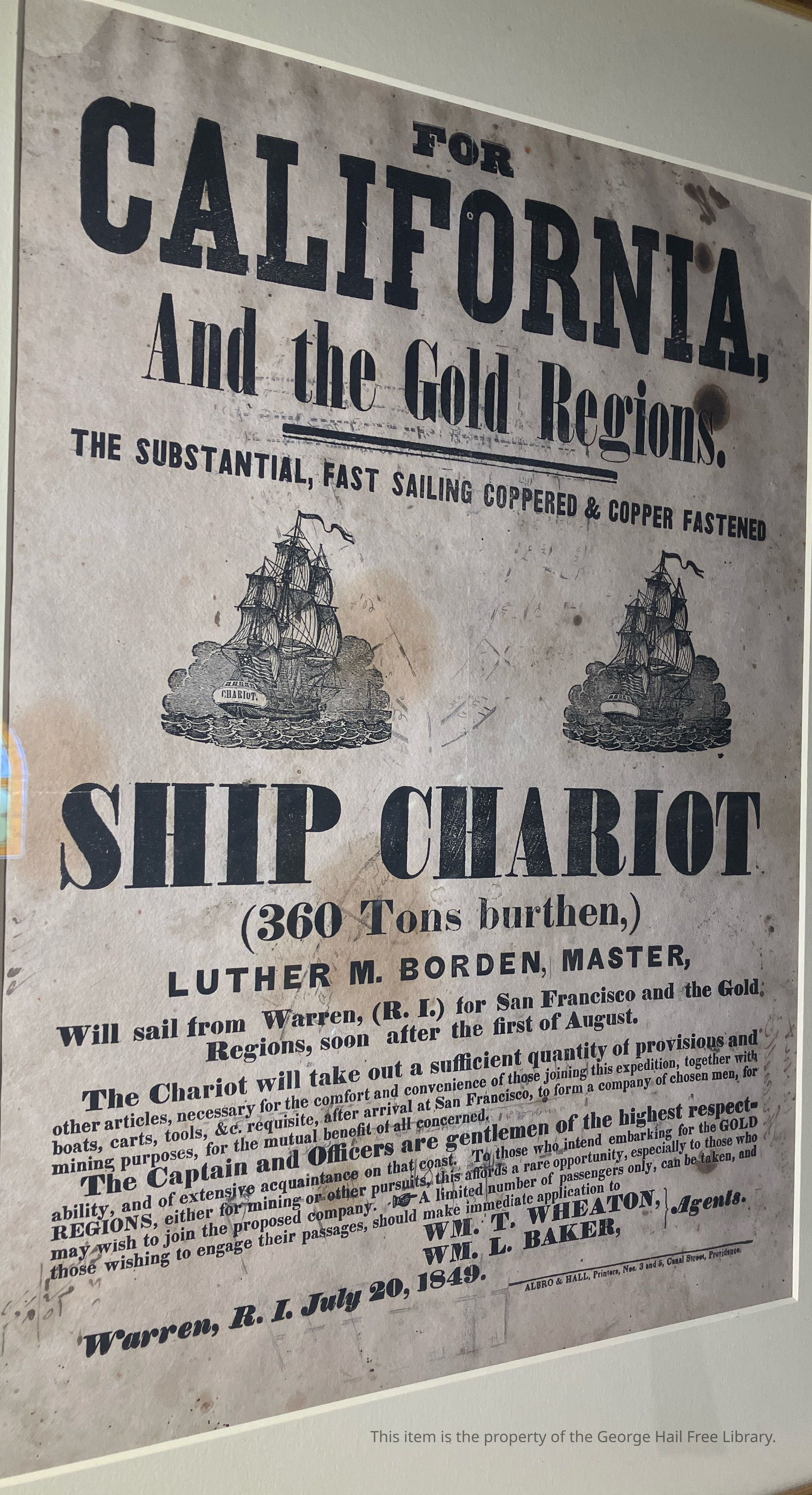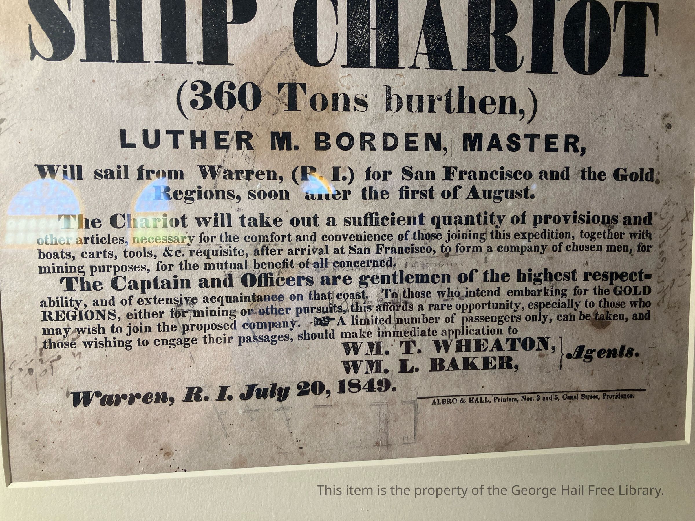 SHIP CHARIOT (360 Tons burthen,) LUTHER M. BORDEN, MASTER, will sail from Warren, (R.I.) for San Francisco and the Gold Region, soon after the first of August.