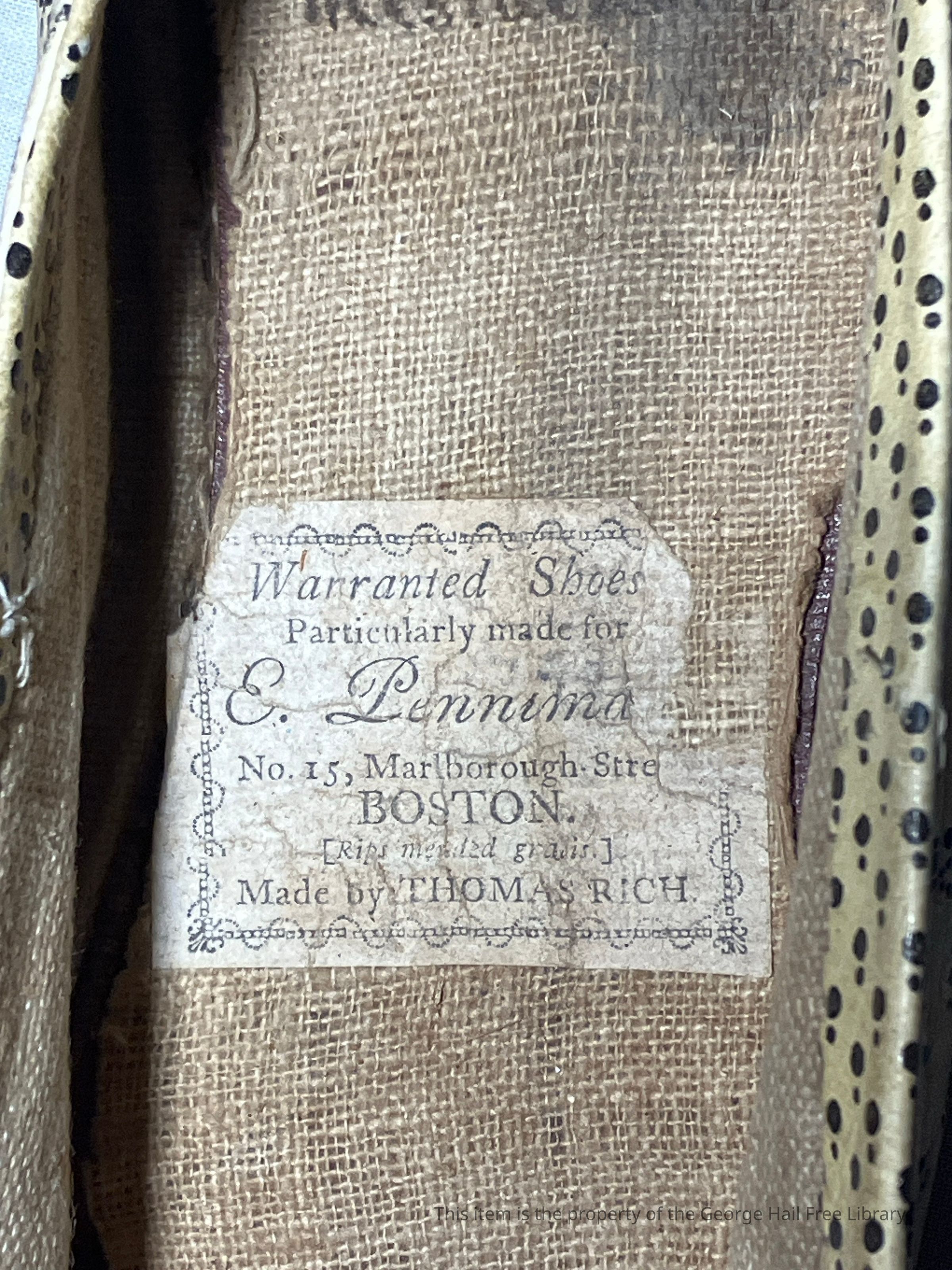 Warrented Shoes Particularly made for E. Pennima No 15, Marlborough Stre[et] BOSTON. (Rips mended gra[lir].) Made by Thomas RichType