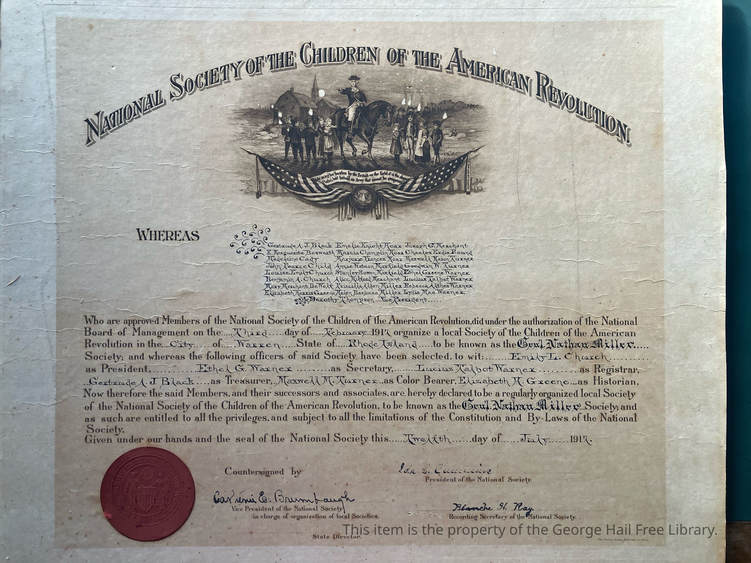 Who are approved Members of the National Society of the Children of the American Revolution, did under the authorization of the National Board of Management on the Third day of February 1917 organize a local Society of the Children of the American Revolution in the City of Warren State of Rhode Island to be known as the [?] Nathan Miller Society; and whereas the following officers of said Society have been selected, to wit: Emily L. Church as President, Ethel G. Warner as Secretary, Lucius Talbot Warner as Registrar, Gertrude A.J. Black as Treasurer, Maxwell M. Turner as Color Bearer, Elizabeth H. Greene as Historian. Now therefore the said members, and their successors and associates, are hereby declared to be a regularly organized local Society of the National Society of the Children of the American Revolution, to be known as the [?] Nathan Miller Society; and as such are entitled to all the privileges, and subject to all the limitations of the Constitution and By-Laws of the National Society.