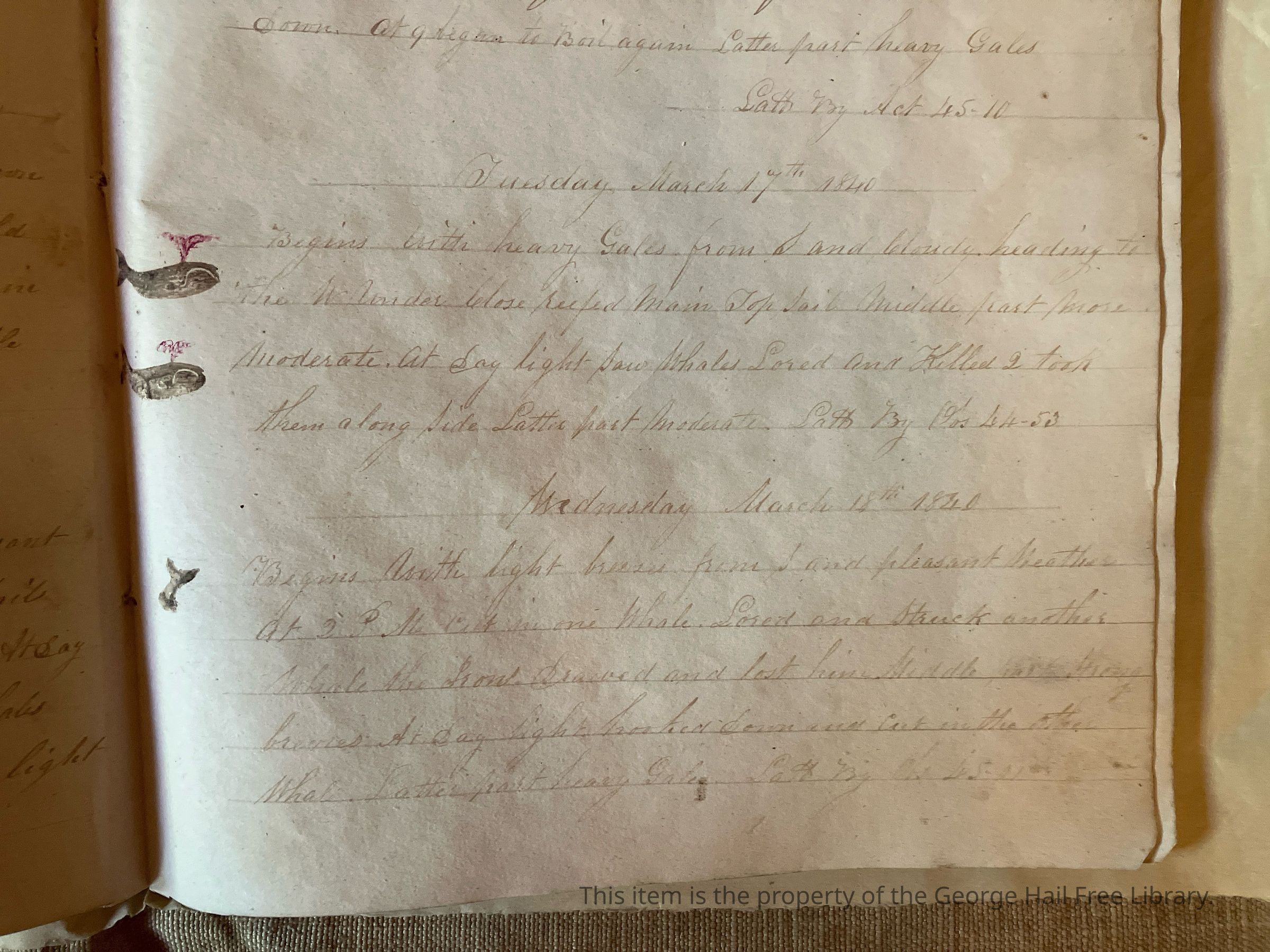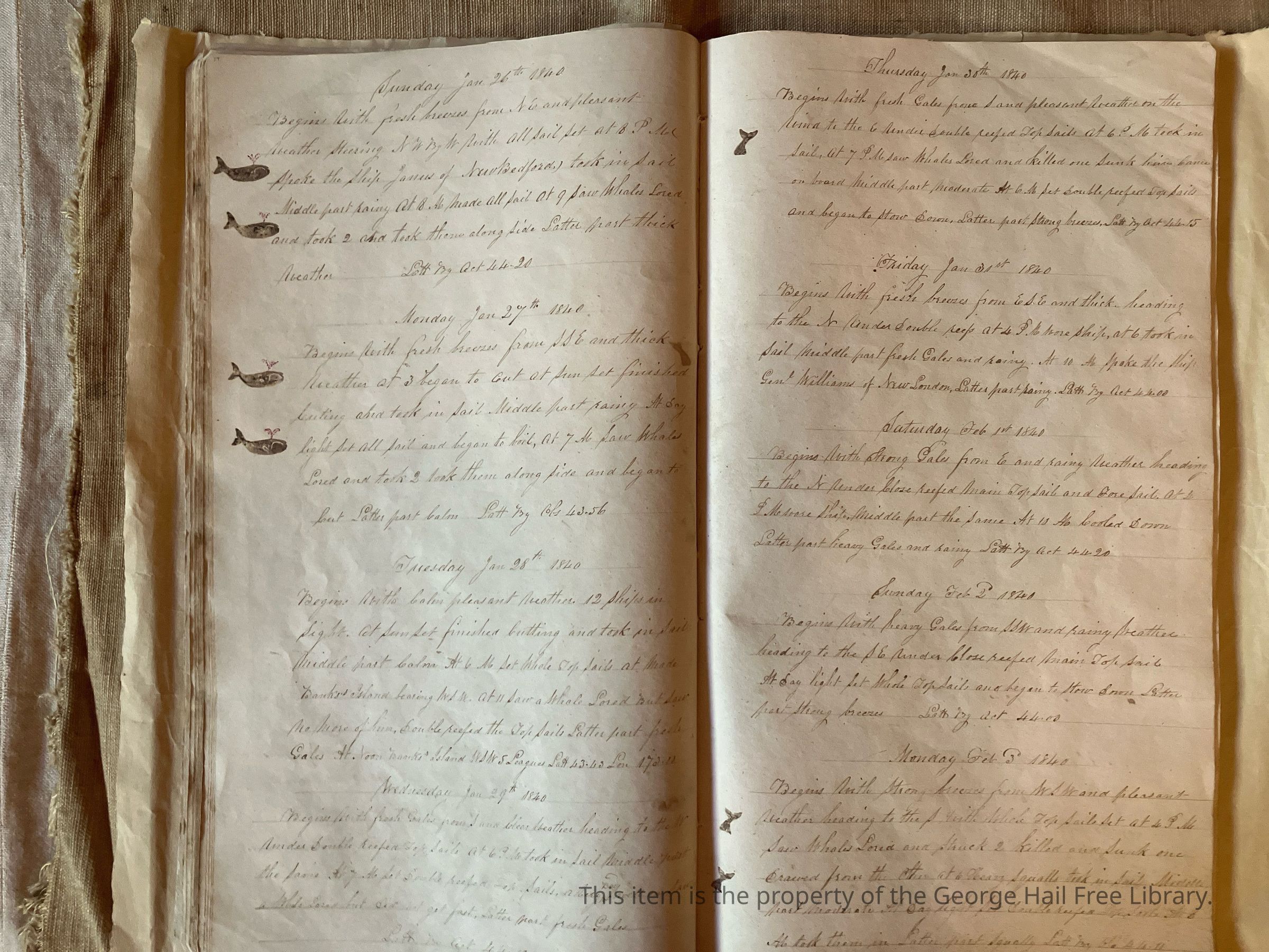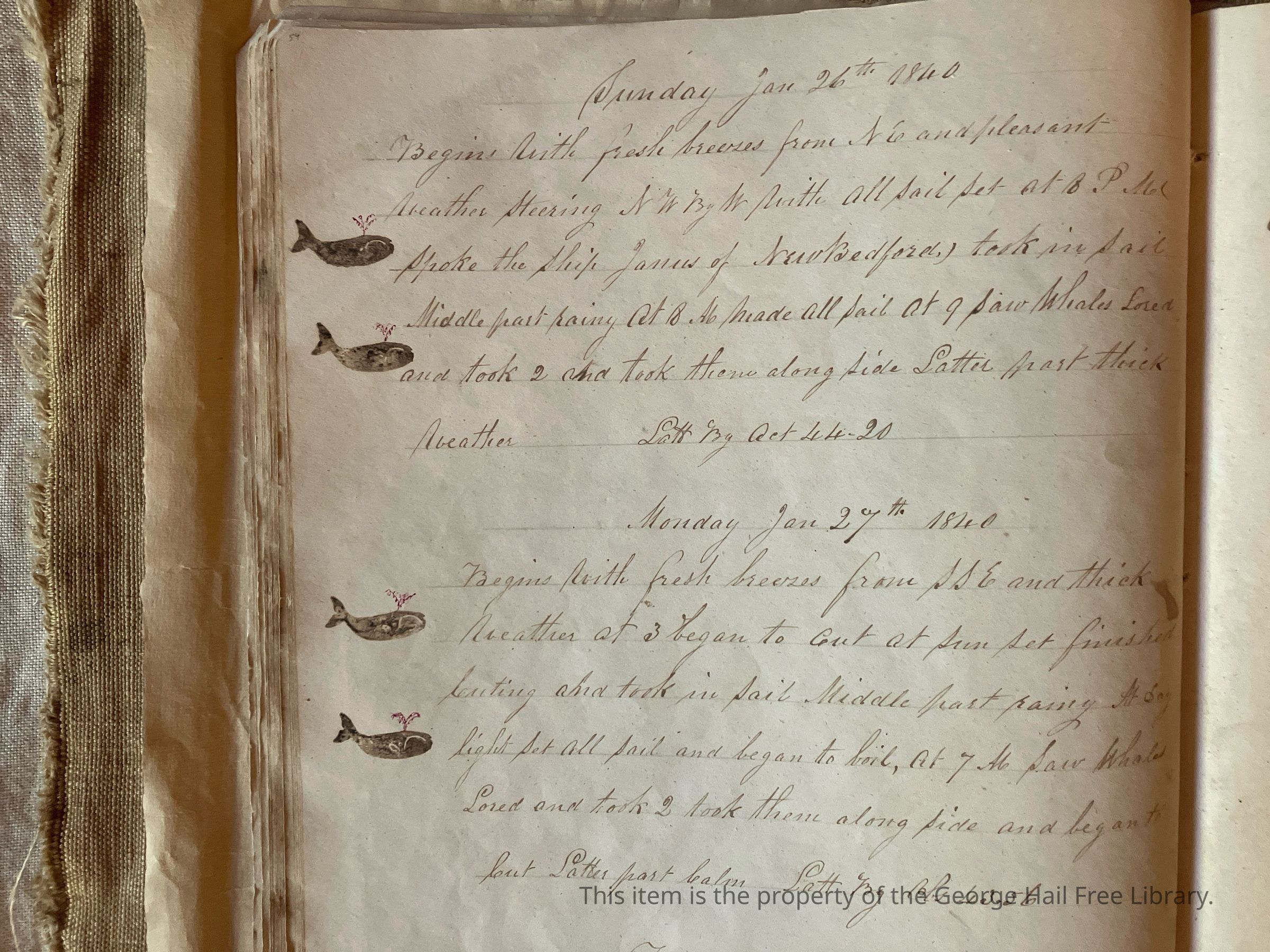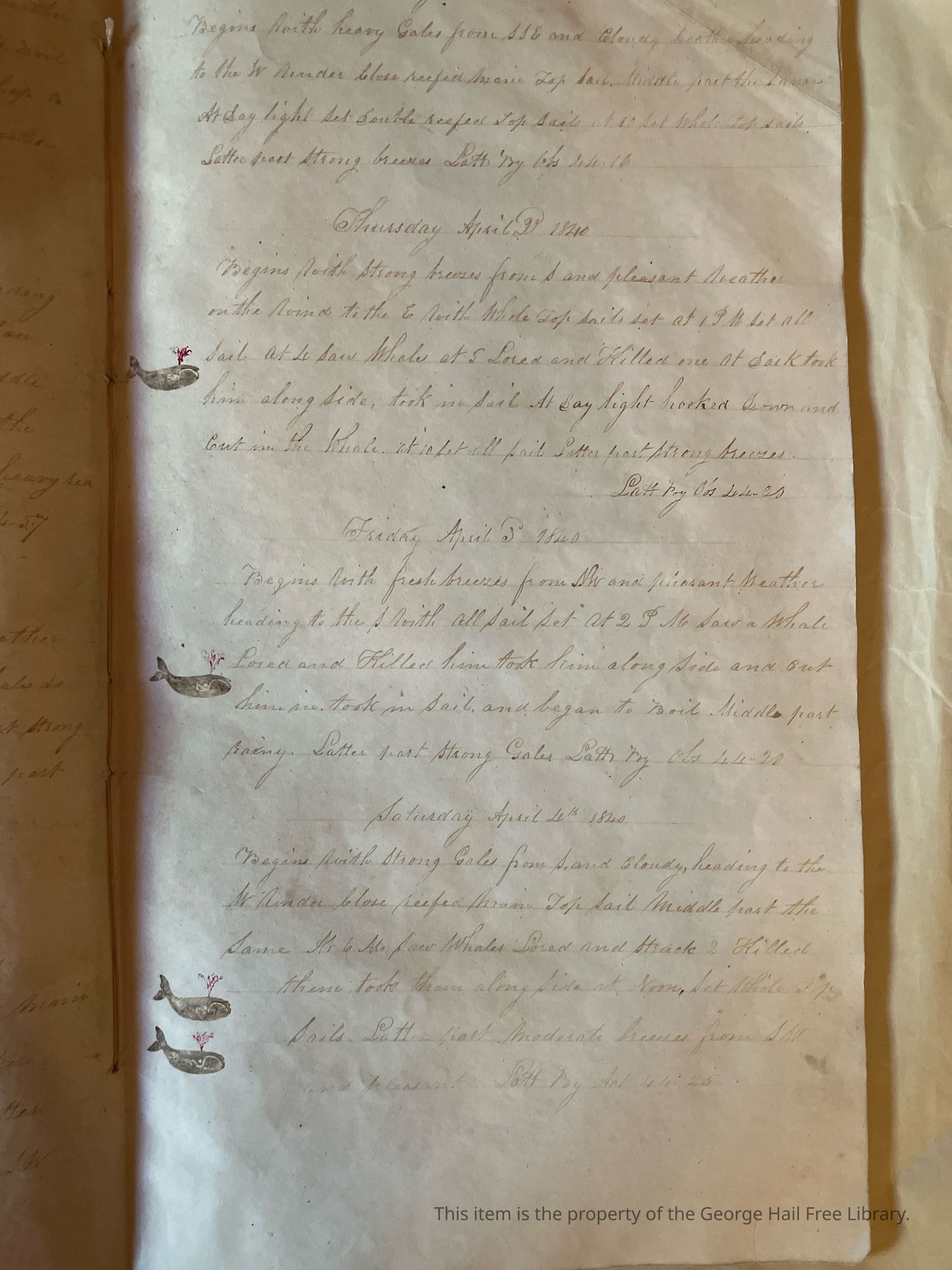 Entries typically started with the day of the week and date. Other information recorded included the position of the vessel, wind speed and direction, and any whales seen or taken, and other encounters with marine life.